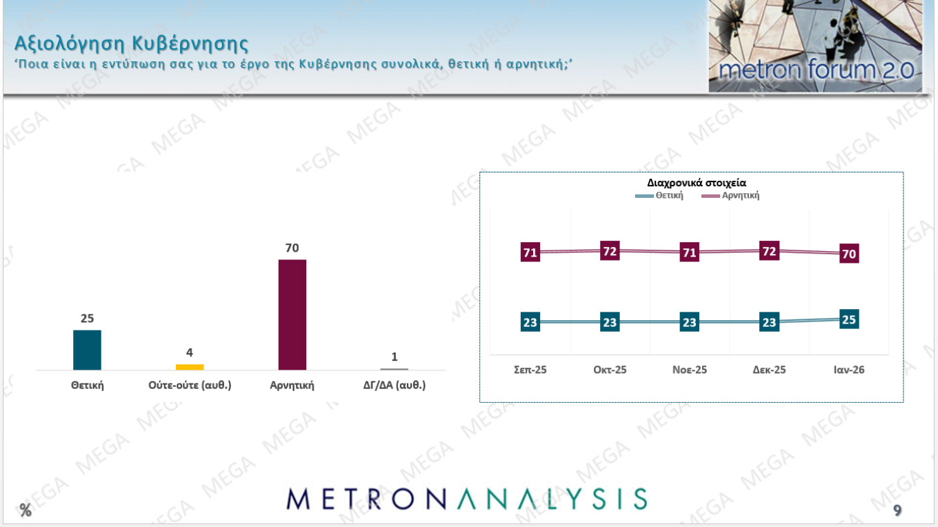 Σαφή ενίσχυση της Νέας Δημοκρατίας με ταυτόχρονη υποχώρηση του ΠΑΣΟΚ σε σχέση με τον Δεκέμβριο καταγράφει η δημοσκόπηση της Metron Analysis, η οποία παρουσιάστηκε στο κεντρικό δελτίο ειδήσεων του Mega την Πέμπτη, με το κυβερνών κόμμα να εμφανίζει άνοδο 1,5 μονάδας στην εκτίμηση ψήφου, ενώ το ΠΑΣΟΚ καταγράφει απώλειες 1,6 μονάδων.