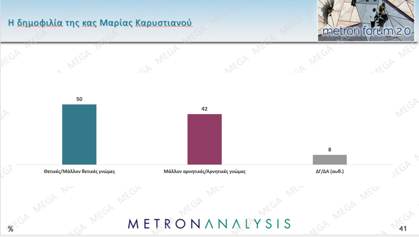 Ιδιαίτερο ενδιαφέρον παρουσιάζουν οι αυθόρμητες απαντήσεις στο ερώτημα για πρωθυπουργό, όπου ο Αλέξης Τσίπρας συγκεντρώνει 6%, ενώ η Μαρία Καρυστιανού μόλις 2%. Ωστόσο, η δημοφιλία της κας Καρυστιανού καταγράφεται στο 50%, ποσοστό υψηλότερο από εκείνο όλων των πολιτικών αρχηγών, ενώ αυξάνεται από 14% σε 16% το ποσοστό όσων δηλώνουν ότι θα μπορούσαν να ψηφίσουν κόμμα με επικεφαλής την ίδια.