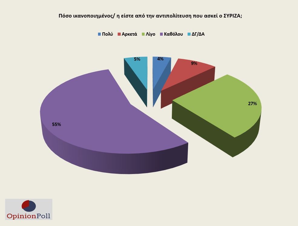 Η ικανοποίηση από την αντιπολίτευση που ασκεί ο ΣΥΡΙΖΑ βρίσκεται μόλις στο 13% (14% στην έρευνα του Οκτωβρίου), φανερώνοντας ότι αδυνατεί να εισπράξει από την δυσαρέσκεια προς την Κυβέρνηση.