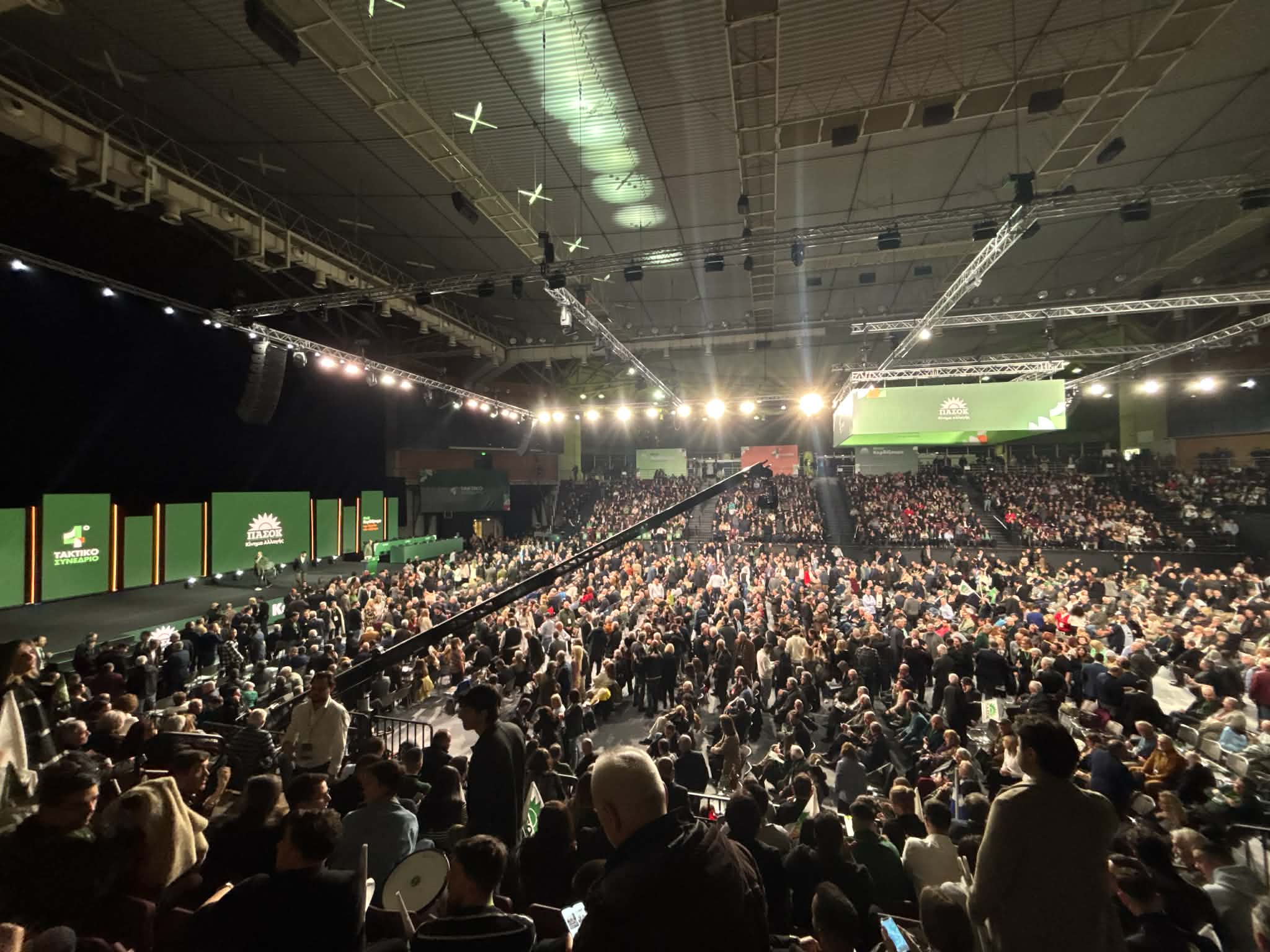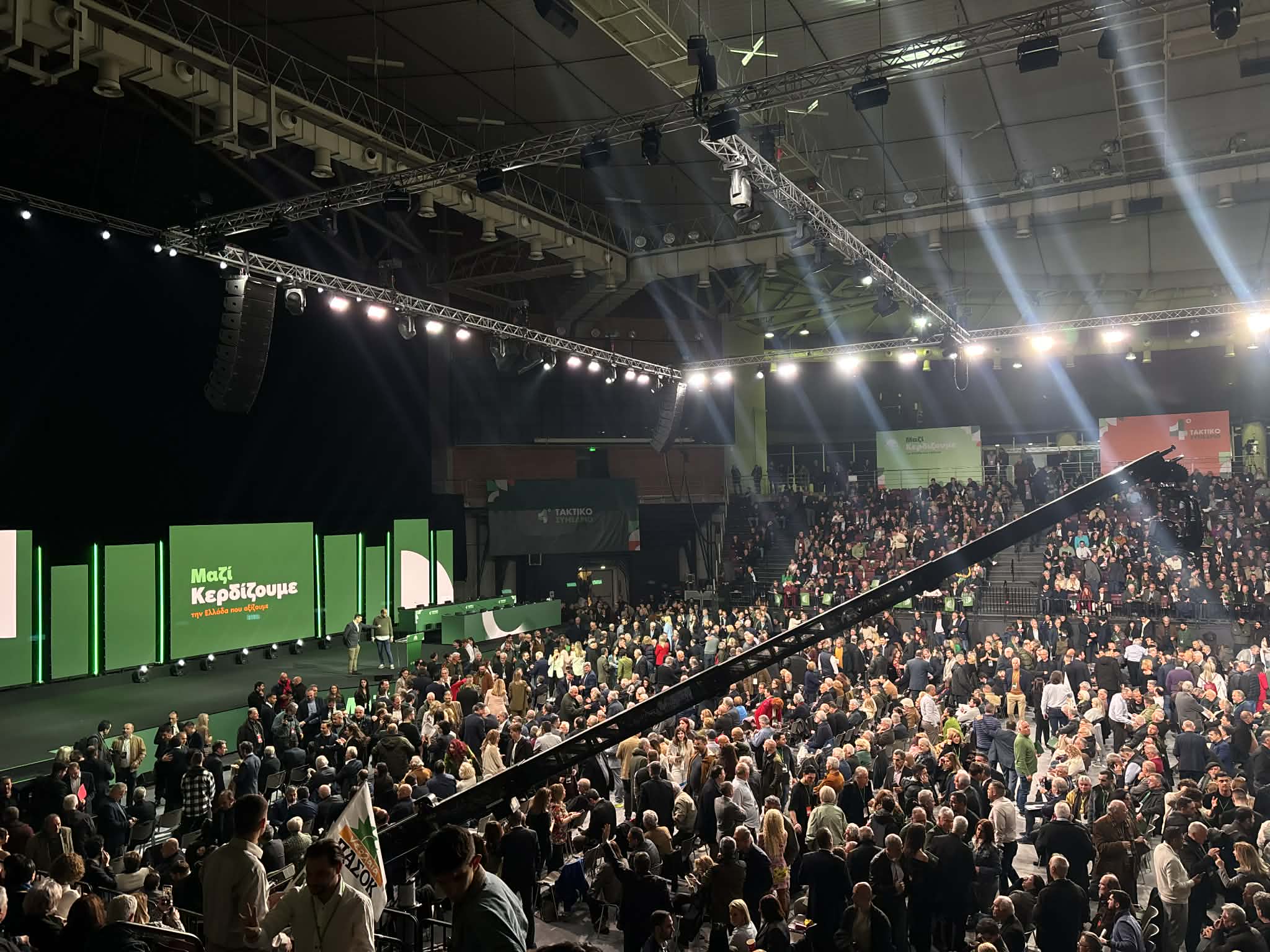 Από νωρίς το απόγευμα, εκατοντάδες στελέχη και μέλη του κόμματος καταφθάνουν στο κλειστό Ολυμπιακό, λαμβάνοντας τις θέσεις τους ενόψει της κρίσιμης τριήμερης πολιτικής διαδικασίας.