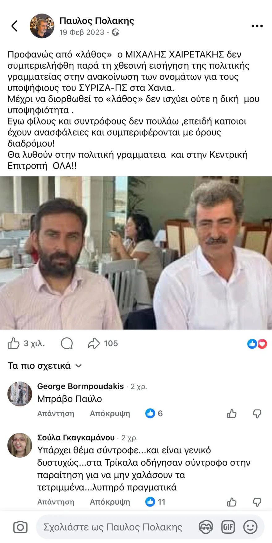 ΥΓ. Επειδή μάλλον δεν τα θυμάται καλά ο Αλέξης η έξοδός μου από τα ψηφοδέλτια δεν έγινε τότε στις 19 Φεβρουαρίου ,αλλά μετά από την ανάρτηση στις 26 Φεβρουαρίου 2023 για το «βαθύ κράτος δικαστών-δημοσιογράφων-τραπεζιτών» που έγινε για να στηρίξω το Νίκο Παππά μετά την ΑΠΑΡΑΔΕΚΤΗ καταδίκη του παρά την αθωωτική εισαγγελική πρόταση για τα κανάλια!
