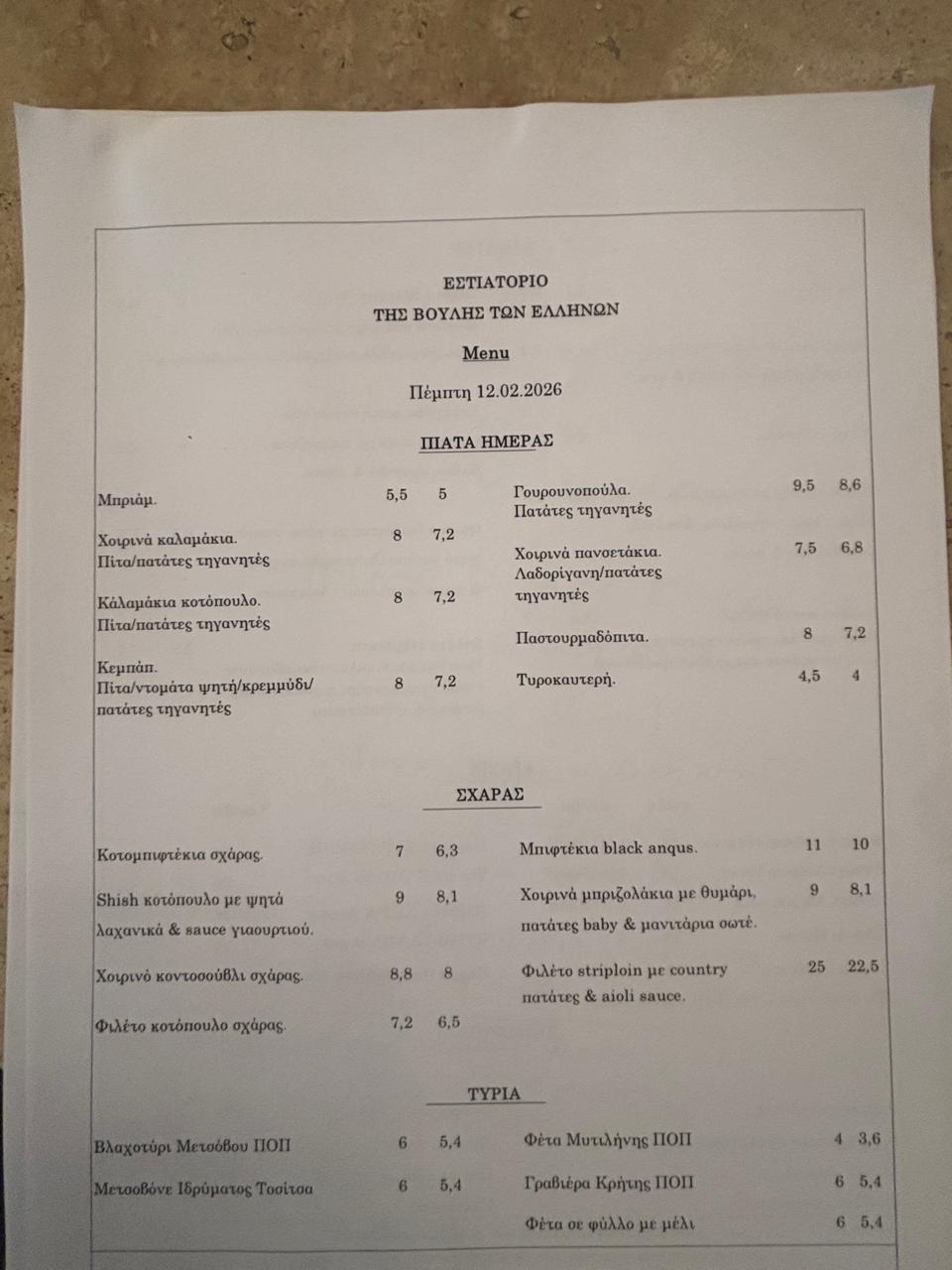 Μα αυτό που ξεχωρίζει στο εστιατόριο της Βουλής είναι οι τιμές! Για παράδειγμα χθες Τσικνοπέμπτη η γουρουνοπούλα μαζί με τηγανητές πατάτες, εάν έτρωγες στο εστιατόριο θα πλήρωνες 9,5 ευρώ τη μερίδα, ενώ εάν την έπαιρνες σε πακέτο 8,6 ευρώ.  Το κεμπάπ (πίτα, ντομάτα ψητή, κρεμμύδι συν πατάτες τηγανητές) μόνον 8 ευρώ η μερίδα και take away 7,2 ευρώ. Τα χοιρινά καλαμάκια, μαζί με πίτα και πατάτες τηγανητές , δεν μπορούσαν να απουσιάσουν από το μενού της Τσικνοπέμπτης με 8 ευρώ.