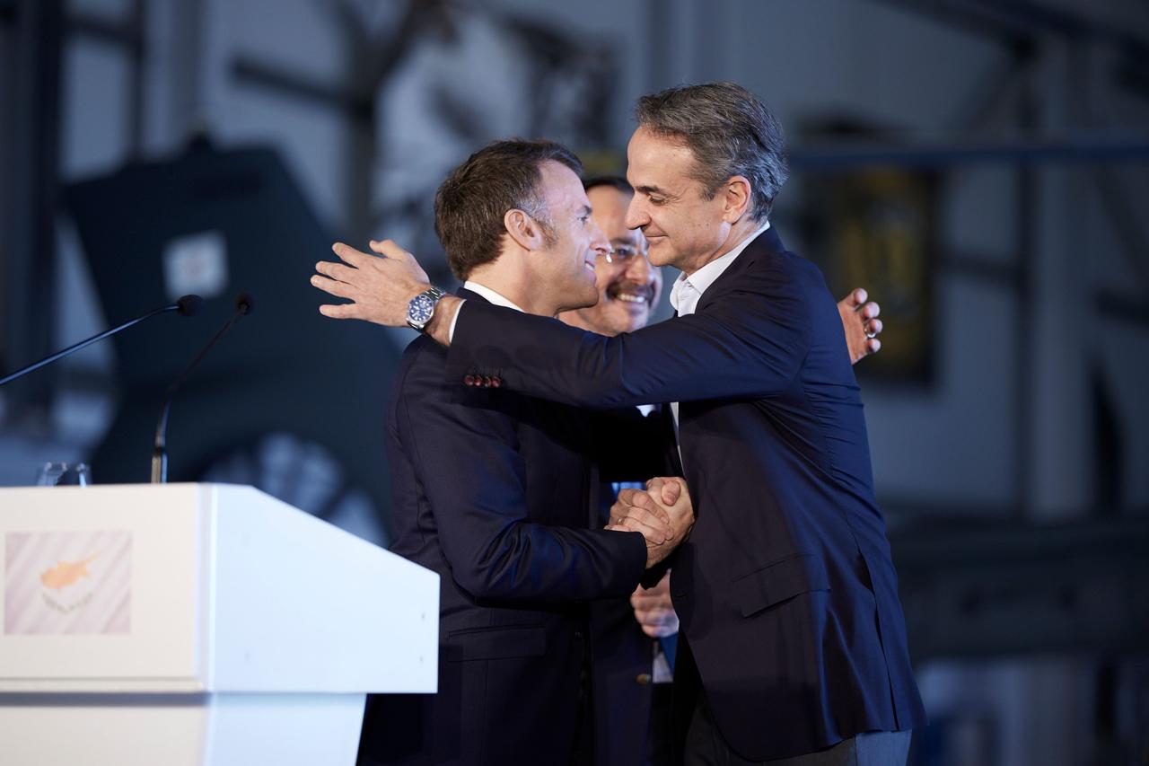 Φορούσε γραβάτα ο Μακρόν, αλλά όταν είδε τους Μητσοτάκη και Χριστοδουλίδη χωρίς γραβάτα, την έβγαλε πάραυτα ενώ περπατούσε στην πίστα του αεροδρομίου της Πάφου.