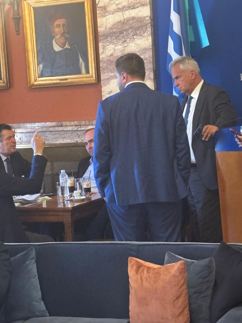 Ο υπόλοιποι βρίσκονταν σε άλλη αίθουσα χωρίς μάσκες και παρακολουθούσαν τον ΚΜ από… τηλεδιάσκεψη (σαν τις παλιές πέτρινες εποχές με την πανδημία).