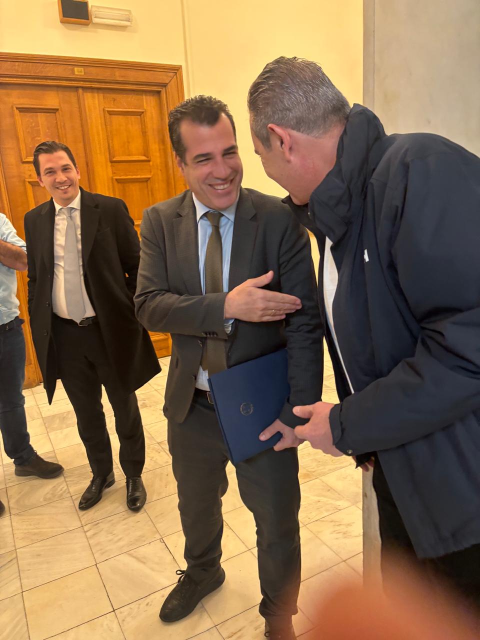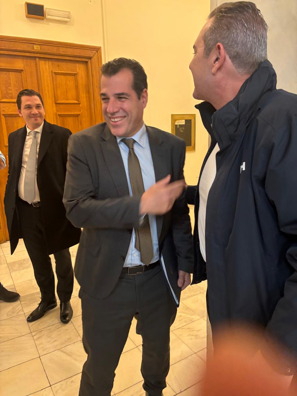 Μόνον που στον διάδρομο «έπεσε πάνω» στον Θάνο Πλεύρη. Αγκαλιάστηκαν, χαιρετήθηκαν, ο Πλεύρης του έκανε μάλιστα και κομπλιμέντα για το αδυνάτισμά του, λέγοντάς του ότι του πάει πολύ να είναι εκτός πολιτικής, αντάλλαξαν δυο- τρεις κουβέντες, αποχαιρέτησε εν συνεχεία ο ένας τον άλλον και ο υπουργός Μεταναστευτικής Πολιτικής έφυγε κρατώντας έναν μπλε φάκελο.