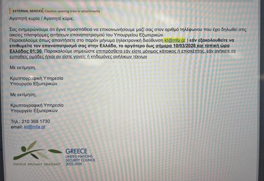 Σας ενημερώνουμε ότι έγινε προσπάθεια να επικοινωνήσουμε μαζί σας στον αριθμό τηλεφώνου που έχει δηλωθεί στις οικείες πλατφόρμες αιτήσεων επαναπατρισμού του Υπουργείου Εξωτερικών.Παρακαλούμε όπως απαντήσετε στο παρόν μήνυμα (ηλεκτρονική διεύθυνση: [email protected] ) εάν εξακολουθείτε να επιθυμείτε τον επαναπατρισμό σας στην Ελλάδα, το αργότερο έως σήμερα 10/03/2026 και τοπική ώρα Ελλάδος 01:30.