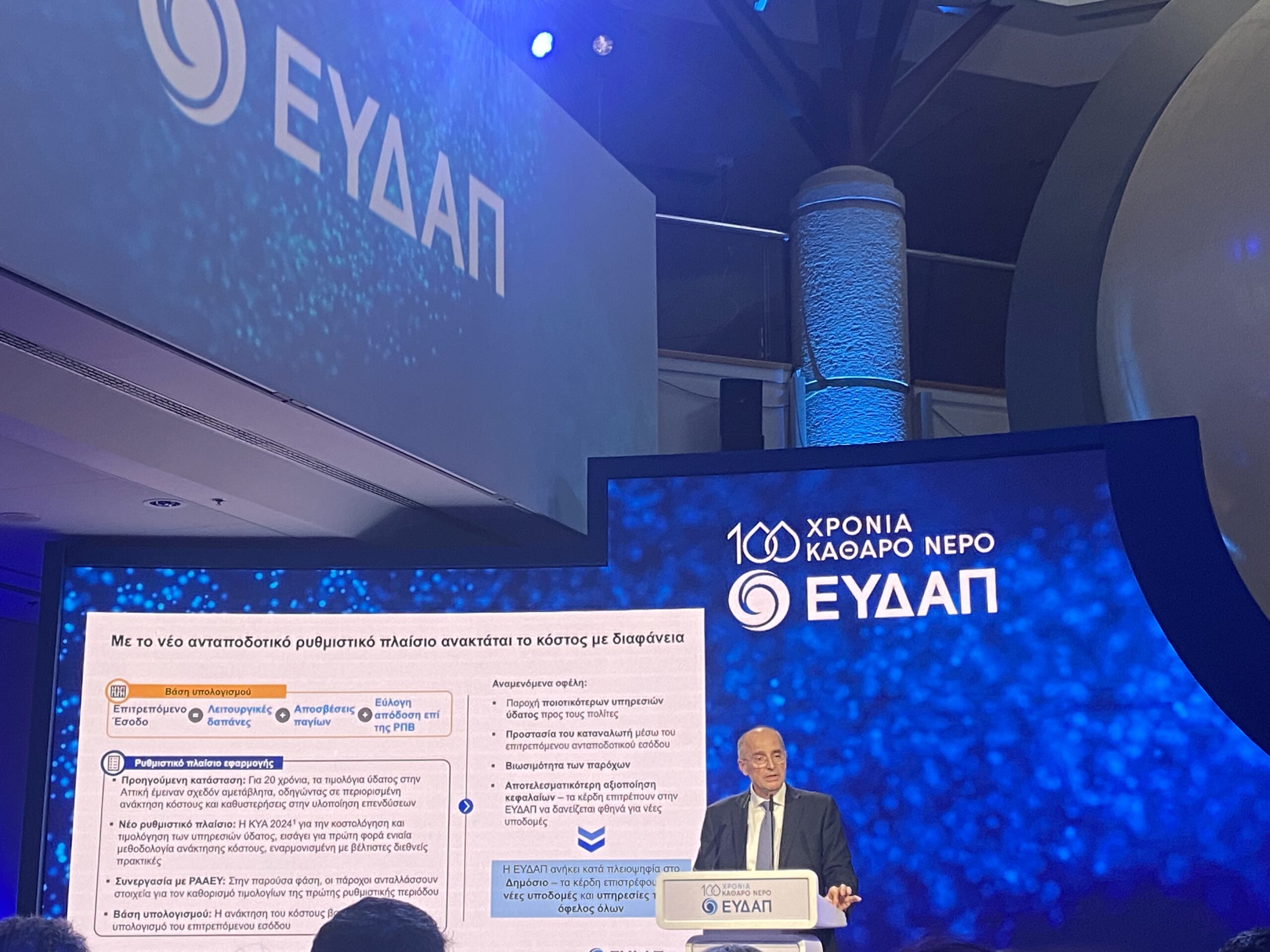 Επέκταση της ΕΥΔΑΠ με απορρόφηση 14 περιφερειακών παρόχων, ενίσχυση του Ευήνου, επενδύσεις στην ΕΥΔΑΠ ύψους 2,5 δις και ένα πλάνο μακροπρόθεσμων και βραχυπρόθεσμων δράσεων ανακοίνωσε σήμερα ο υπουργός ενέργειας Σταύρος Παπασταύρου μιλώντας στην εκδήλωση για τα 100 χρόνια της ΕΥΔΑΠ, στο Εθνικό Μουσείο Φυσικής Ιστορίας Γουλανδρή.