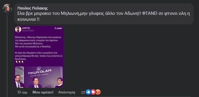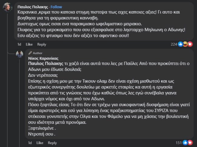 Ο Παύλος Πολάκης απάντησε σε υψηλούς τόνους, χαρακτηρίζοντας τον Καρανίκα «παρακμιακό ωφελιμιστικό μειράκιο» και κατηγορώντας τον ότι «γλείφει» τον Άδωνι Γεωργιάδη επειδή καταδίκασε τη βία και επιτέθηκε –όπως είπε– σε «αριστερούς τραμπούκους». Παράλληλα, άφησε αιχμές για την επαγγελματική δραστηριότητα του Καρανίκα στον χώρο της φαρμακευτικής κάνναβης, ανεβάζοντας ακόμη περισσότερο το θερμόμετρο της αντιπαράθεσης.