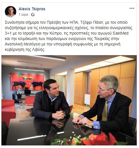 Με τον πρέσβη των ΗΠΑ, Τζέφρι Πάιατ, συναντήθηκε ο Αλέξης Τσίπρας, όπως ανέφερε ο ίδιος σε ανάρτησή του στον επίσημο λογαριασμό του στο Facebook.