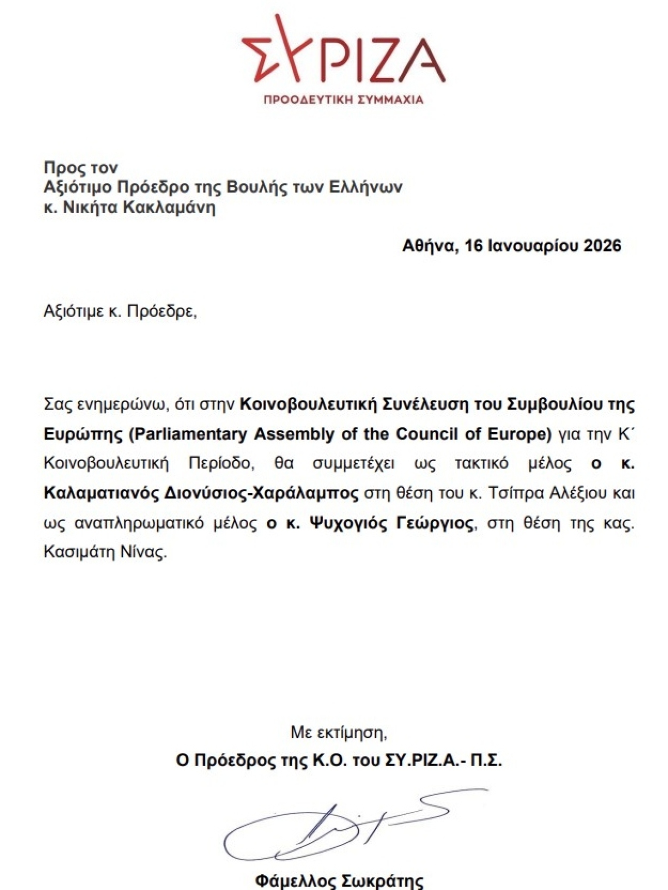 Με επιστολή του προς τον Πρόεδρο της Βουλής, Νικήτα Κακλαμάνη, ο κ. Φάμελλος γνωστοποίησε ότι στην Κοινοβουλευτική Συνέλευση του Συμβουλίου της Ευρώπης, για την Κ΄ Κοινοβουλευτική Περίοδο, τακτικό μέλος θα είναι ο Διονύσης Καλαματιανός και αναπληρωματικό ο Γιώργος Ψυχογιός. Έως σήμερα, τη θέση του εκπροσώπου του ΣΥΡΙΖΑ κατείχε ο Αλέξης Τσίπρας, ο οποίος έχει παραιτηθεί από τη βουλευτική του ιδιότητα, με αναπληρωματικό μέλος τη Νίνα Κασιμάτη.