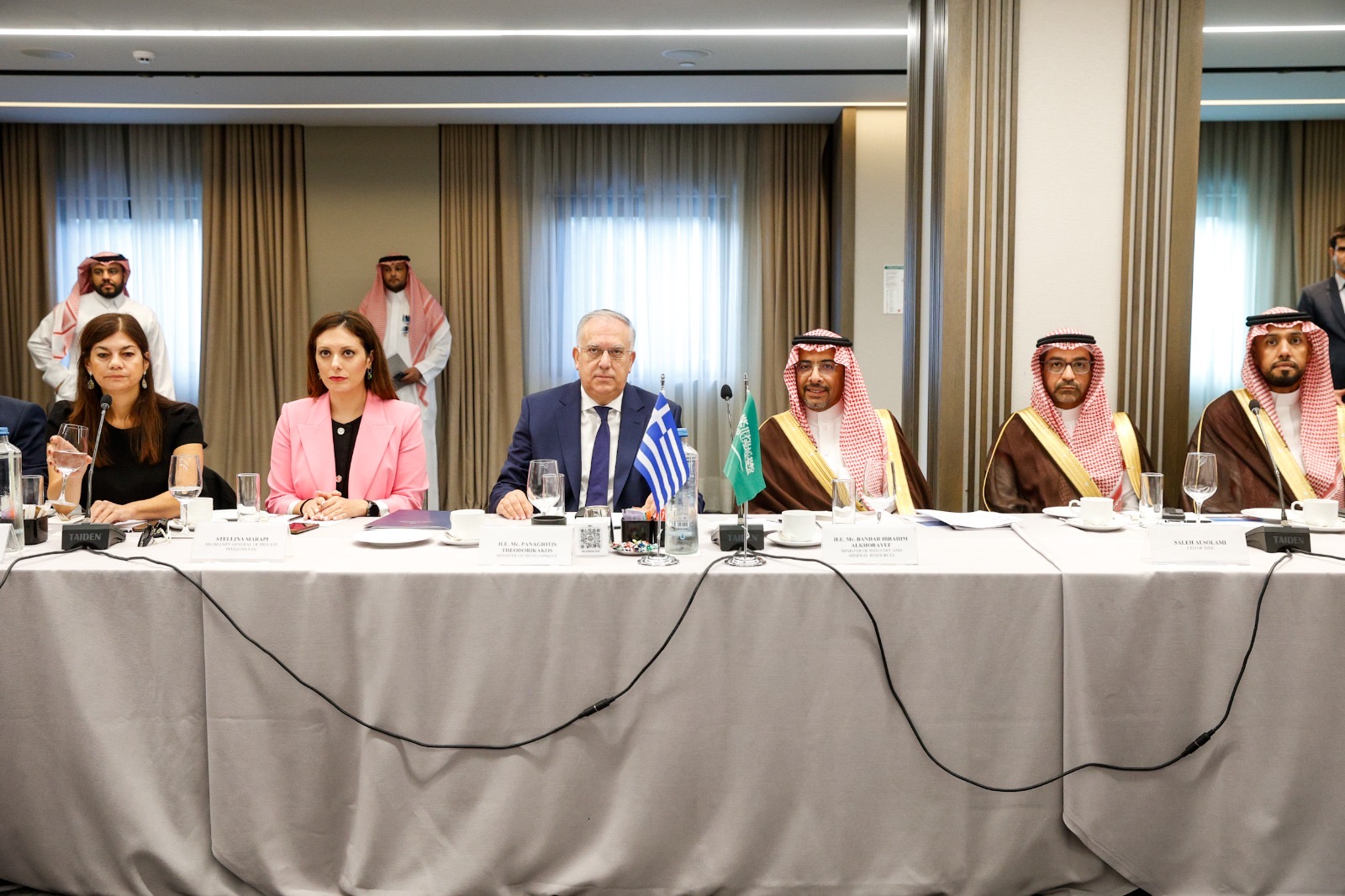 Με τη συμμετοχή εκπροσώπων μεγάλων ελληνικών επιχειρήσεων, πραγματοποιήθηκε «πρωινό εργασίας» του υπουργού Ανάπτυξης Τάκη Θεοδωρικάκου με τον υπουργό Βιομηχανίας και Ορυκτών Πόρων της Σαουδικής Αραβίας Bandar Ibrahim Alkhorayef, «επιβεβαιώνοντας την κοινή βούληση για περαιτέρω εμβάθυνση των στρατηγικών σχέσεων Ελλάδας-Σαουδικής Αραβίας» όπως σημειώνεται σε ανακοίνωση του Υπουργείου.