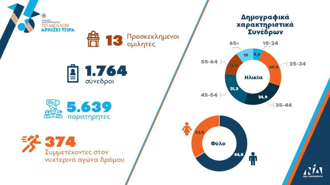 Με την ομιλία του πρωθυπουργού, Κυριάκου Μητσοτάκη, αρχίζουν σήμερα το απόγευμα (19:30) οι τριήμερες εργασίες του 13ου συνεδρίου της Νέας Δημοκρατίας με κεντρικό σύνθημα «Το Μέλλον αρχίζει Τώρα». Στο συνέδριο συμμετέχουν ως σύνεδροι ή παρατηρητές 7.000 στελέχη και μέλη του κόμματος: 1.766 σύνεδροι, 5.639 παρατηρητές και 13 προσκεκλημένοι ομιλητές, με το 50% των συνέδρων να ανήκει στις ηλικίες 25-44 ετών.