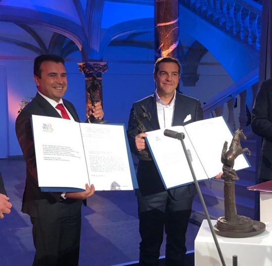 «Στόχος της Συμφωνίας των Πρεσπών ήταν να ριζώσει βαθειά στις συνειδήσεις των λαών μας και στις σχέσεις των χωρών μας», ανέφερε ο πρόεδρος του ΣΥΡΙΖΑ, Αλέξης Τσίπρας κατά την τελετή ανάληψης του βραβείου Βεστφαλίας, από κοινού με τον πρωθυπουργό της Βόρειας Μακεδονίας, Ζόραν Ζάεφ.