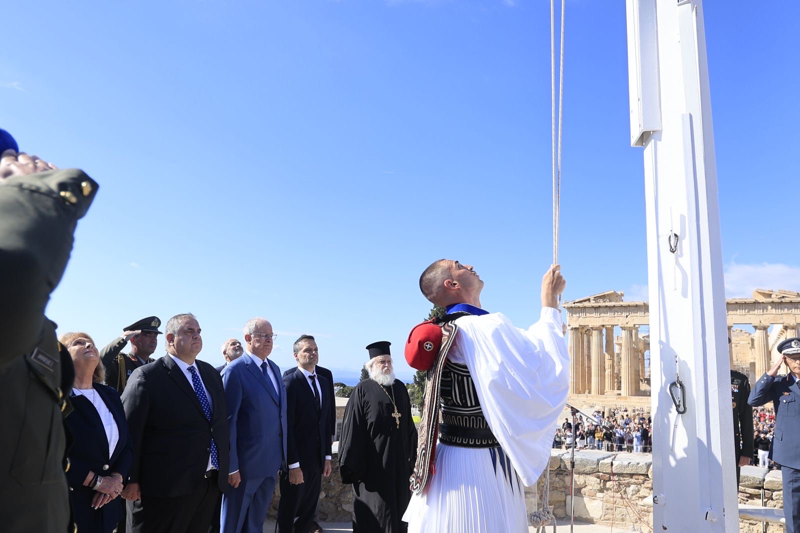 «Με αισθήματα βαθιάς συγκίνησης και εθνικής υπερηφάνειας στεκόμαστε σήμερα εδώ, στον Ιερό Βράχο της Ακρόπολης, για να τιμήσουμε την 81η Επέτειο της Απελευθέρωσης των Αθηνών από τα στρατεύματα της γερμανικής κατοχής.