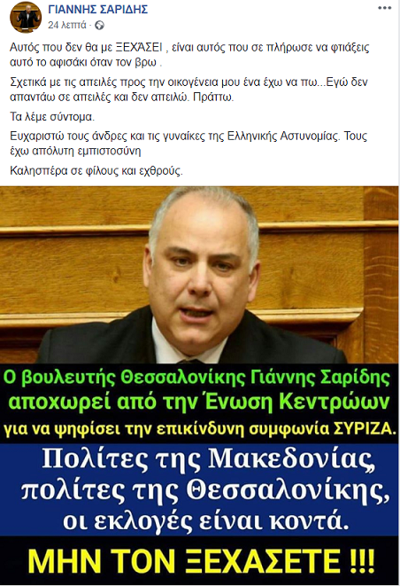 Στόχος απειλών καταγγέλλει ότι γίνεται ο βουλευτής της Ένωσης Κεντρώων Γιάννης Σαρίδης.
