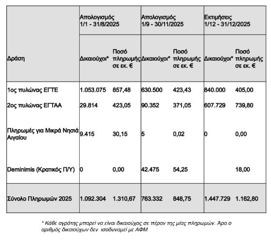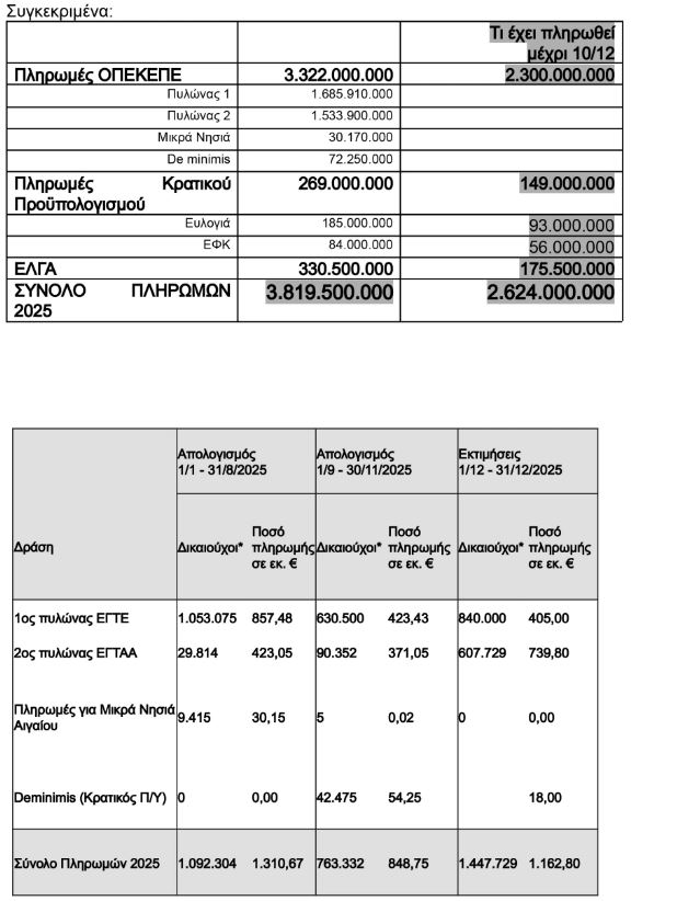 «Κατά το διάστημα από 1η Ιανουαρίου έως 31 Δεκεμβρίου 2025 προβλέπεται ότι θα έχουν καταβληθεί στους αγρότες 3,8 δις ευρώ από τον ΟΠΕΚΕΠΕ, τον Κρατικό Προϋπολογισμό και τον ΕΛΓΑ. Μέχρι σήμερα έχουν πληρωθεί στους αγρότες 2,6 δις ευρώ και μέχρι τέλος Δεκεμβρίου θα πληρωθεί επίσης 1,2 δις ευρώ, ανακοίνωσε το υπουργείο Αγροτικής Ανάπτυξης μετά το τέλος της ενημέρωσης του υπουργού Κώστα Τσιάρα προς τους βουλευτές της Νέας Δημοκρατίας.