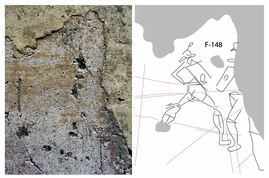 Μεταξύ των πιο εντυπωσιακών ανακαλύψεων είναι ένα ελαφρά χαραγμένο σχέδιο δύο μονομάχων κοντά σε μία σκάλα που οδηγεί στην περιοχή καθισμάτων του θεάτρου. Οι μονομάχοι που παριστάνονται τη στιγμή της μάχης, έχουν ο καθένας τους ύψος στο σχέδιο, μόλις 10 εκατοστών, ωστόσο η σκηνή αποπνέει αξιοσημείωτη κίνηση. Ο ένας γέρνει προς τα πίσω ενώ προβάλλει το δεξί του πόδι κρατώντας την ασπίδα του και με το σπαθί υψωμένο. Ο αντίπαλός του αντικατοπτρίζει στάση άμυνας ενώ η σύνθεση στο σύνολό της υποδηλώνει κίνηση, ισορροπία και ένταση παρά στατικό συμβολισμό.