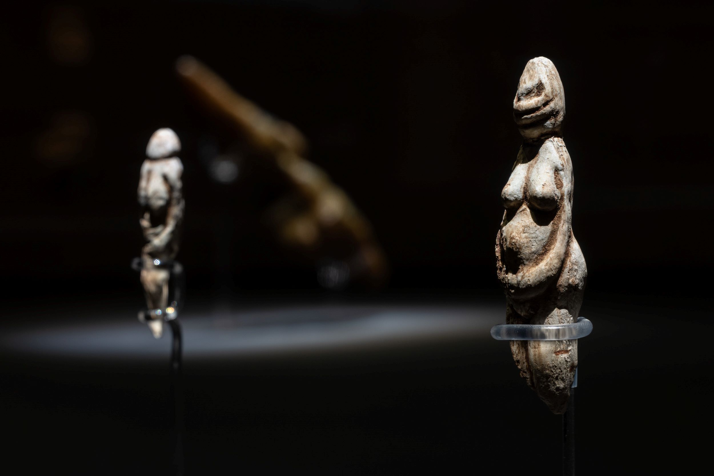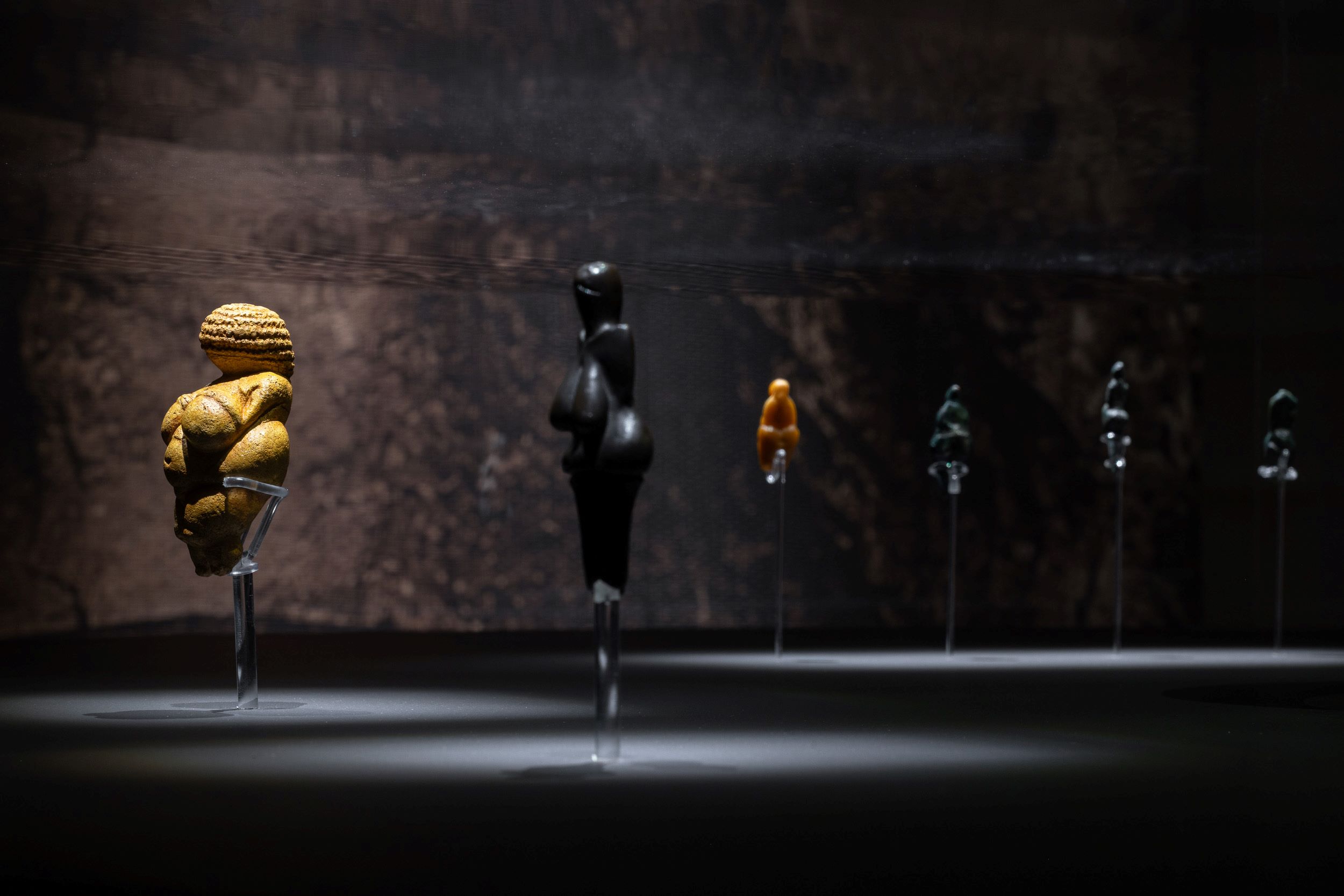 Εκτός από το αντίγραφο της παλαιολιθικής «Αφροδίτης του Lespugue» από το Muséum Νational d’Histoire Νaturelle στο Παρίσι, η έκθεση παρουσιάζει άλλες εννέα «Αφροδίτες» της ίδιας εποχής, οι οποίες αποκαλύπτουν ένα κοινό μορφολογικό λεξιλόγιο που επαναλαμβάνεται σε μεγάλες γεωγραφικές αποστάσεις. Το ταξίδι αρχίζει με την «Αφροδίτη του Lespugue», που ανακαλύφθηκε στο σπήλαιο Rideaux στη νότια Γαλλία και είναι σκαλισμένη σε χαυλιόδοντα μαμούθ. Η διογκωμένη κοιλιακή χώρα, οι έντονοι γοφοί και το στήθος της αποτελούν χαρακτηριστικά στοιχεία μιας μορφής που δίνει έμφαση στη γονιμότητα και τη ζωτική δύναμη του σώματος. Ακολουθούν οι «Αφροδίτες του Grimaldi», που προέρχονται από τα σπήλαια Balzi Rossi κοντά στα γαλλοϊταλικά σύνορα και παρουσιάζουν μια διαφορετική, πιο επιμήκη απόδοση της γυναικείας μορφής. Από την Ιταλία προέρχεται η «Αφροδίτη του Savignano», ένα γλυπτό από λίθο με έντονα αφαιρετική μορφή ενώ από την κεντρική Ευρώπη η έκθεση περιλαμβάνει την «Αφροδίτη του Dolní Věstonice», ένα από τα αρχαιότερα γνωστά κεραμικά γλυπτά στην ιστορία της ανθρωπότητας. Η έκθεση συνεχίζεται με την περίφημη «Αφροδίτη του Willendorf» από την Αυστρία, ένα από τα πιο αναγνωρίσιμα έργα της παλαιολιθικής τέχνης, καθώς και με τις δύο «Αφροδίτες της Parabita» από τη νότια Ιταλία.
