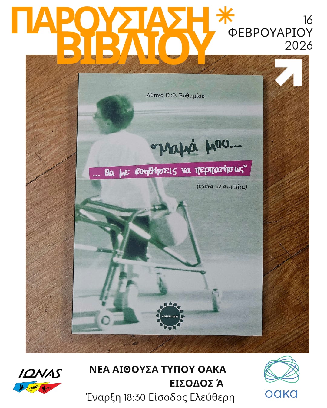 Ο Σύλλογος ΙΩΝΑΣ ΑμεΑ, σε συνδιοργάνωση με τη Διοίκηση του ΟΑΚΑ, παρουσιάζει το βιβλίο της κας Αθηνάς Ευθυμίου, «Μαμά μου…θα με βοηθήσεις να περπατήσω;», αφιερωμένο στην προσπάθεια του γιου της, Αλέξη, να περπατήσει.