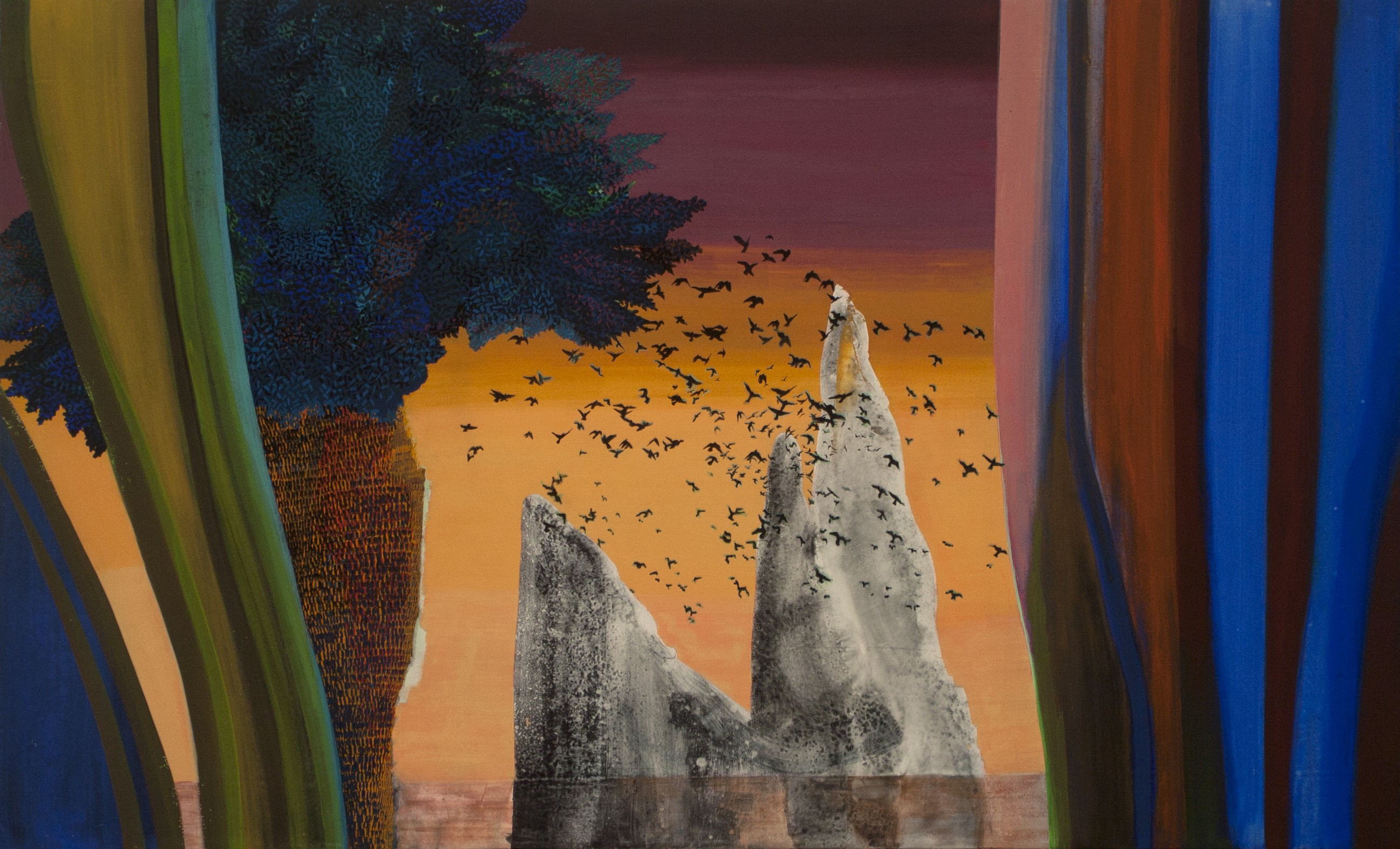 Η ίδια το χρησιμοποιεί ώστε να εμβαπτιστεί, να γίνει ένα με τη φύση, να απελευθερωθεί, να ξεχαστεί. Ένας από τους πίνακές της τιτλοφορείται πάτσα μάμα, όπως οι διάφορες τελετουργίες των γηγενών που πραγματοποιούνται για να εξευμενίσουν τα ποικίλα φαινόμενα της φύσης. Εν προκειμένω “έχοντας πάρει αυτό το ναρκωτικό άρχισε να βλέπει τη φύση ως ανθρωπόμορφο ον. Δεν υπάρχει ανθρώπινη φιγούρα per se αλλά διακρίνεται μια μορφή, μια οντότητα που μοιάζει να ξεπηδάει σαν φάντασμα”, εξηγεί η Μαρίνα. Αυτή δημιουργείται σαν γλυπτό από τις πολλαπλές στρώσεις ακουαρέλας οι οποίες κρύβονται πίσω από το λάδι πάνω στο ξύλο που χρησιμοποίησε ως καμβά της.