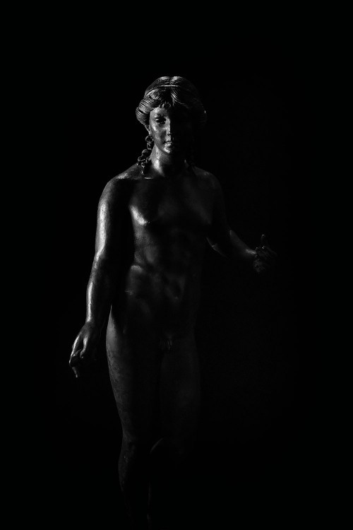Αυτός ο χάλκινος θεός, ένας ανδρόγυνος Απόλλωνας, κρατά μια πένα, αλλά έχει χάσει την κιθάρα που του έδωσε το όνομά του. Χαμένο, επίσης, είναι και το αρχικό έντονο χρώμα του, που χάθηκε ενώ κατέβαινε από τα ουράνια, φέροντας σημάδια της ανθρώπινης μοίρας μας. Φωτογράφισα τον άψυχο θεό, ψάχνοντας για ένα ψήγμα ψυχής. Το βλέμμα μου αιχμαλωτίστηκε από το φως και τις σκιές των γραμμών και των καμπύλων που δημιούργησε το χέρι του καλλιτέχνη.