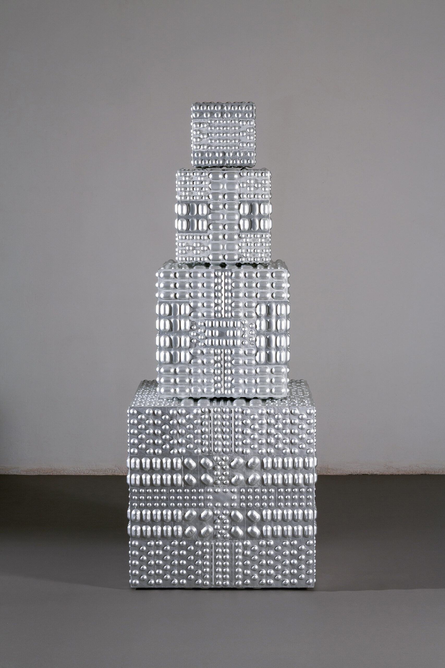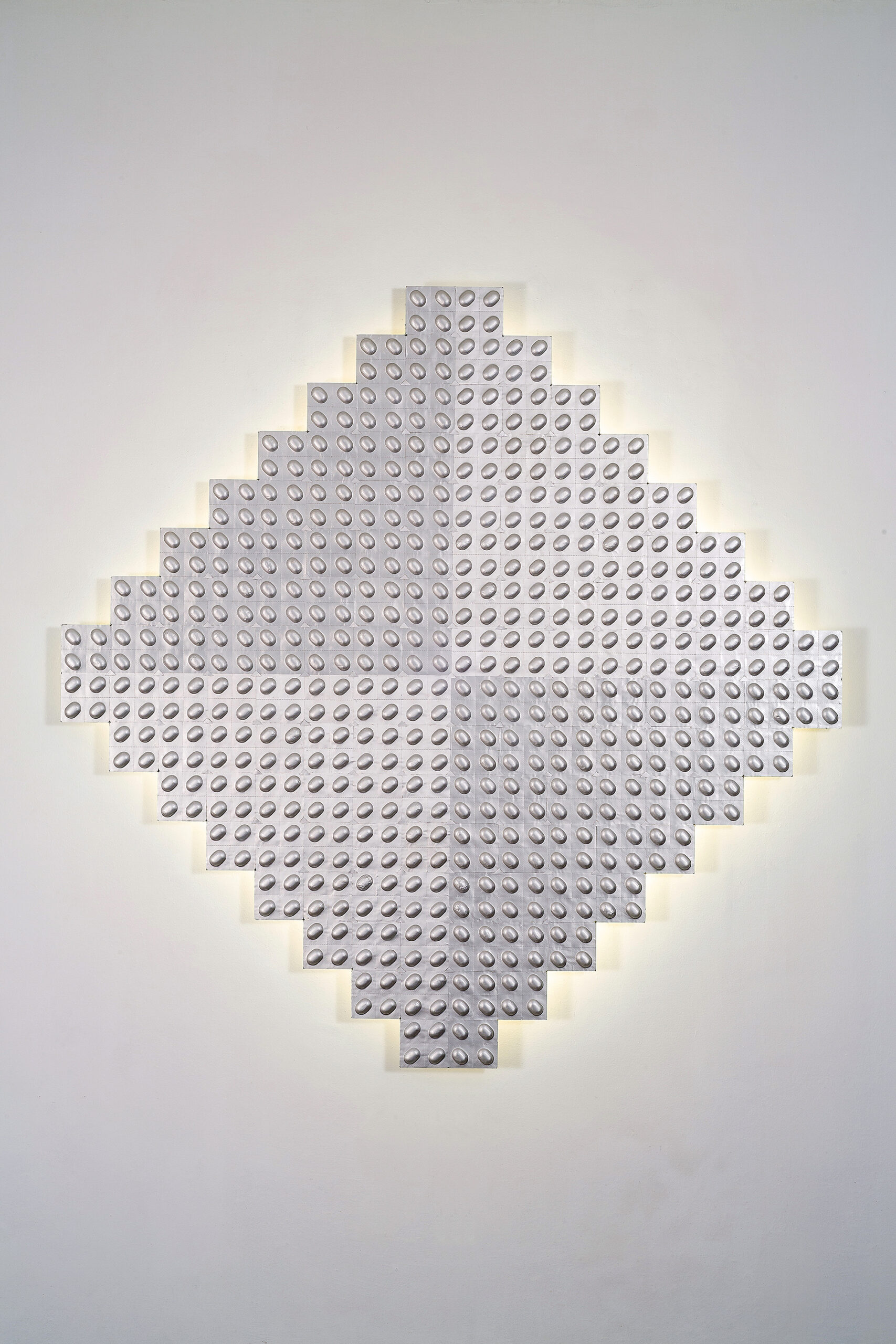 Στο κέντρο του εκθεσιακού χώρου στη Γκαλερί Ζουμπουλάκη δέσποζε ένας μεγάλος πολυέλαιος με τη μορφή ανεστραμμένου Ζιγκουράτ. Η μεγάλη αυτή σύνθεση απαρτιζόταν από διαφανείς κάψουλες-χάπια και από άδειες καρτέλες χαπιών (blister) και αναρτήθηκε σε ικρίωμα (τρία επί τρία μέτρα). Το ζιγκουράτ, ως αρχέτυπο της ανόδου και της σύνδεσης ουρανού και γης, φέρει μέσα του την έννοια της ιεραρχίας.