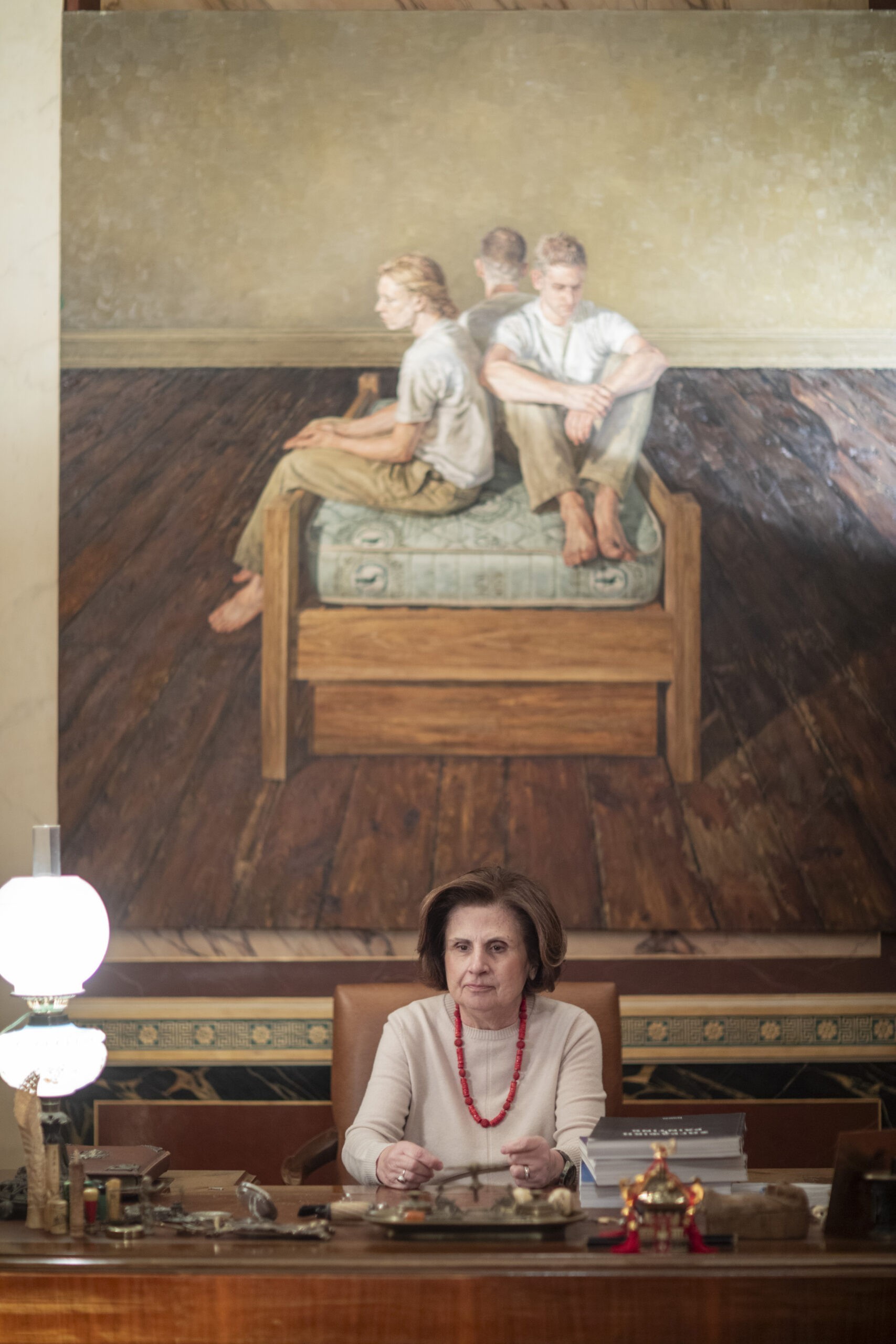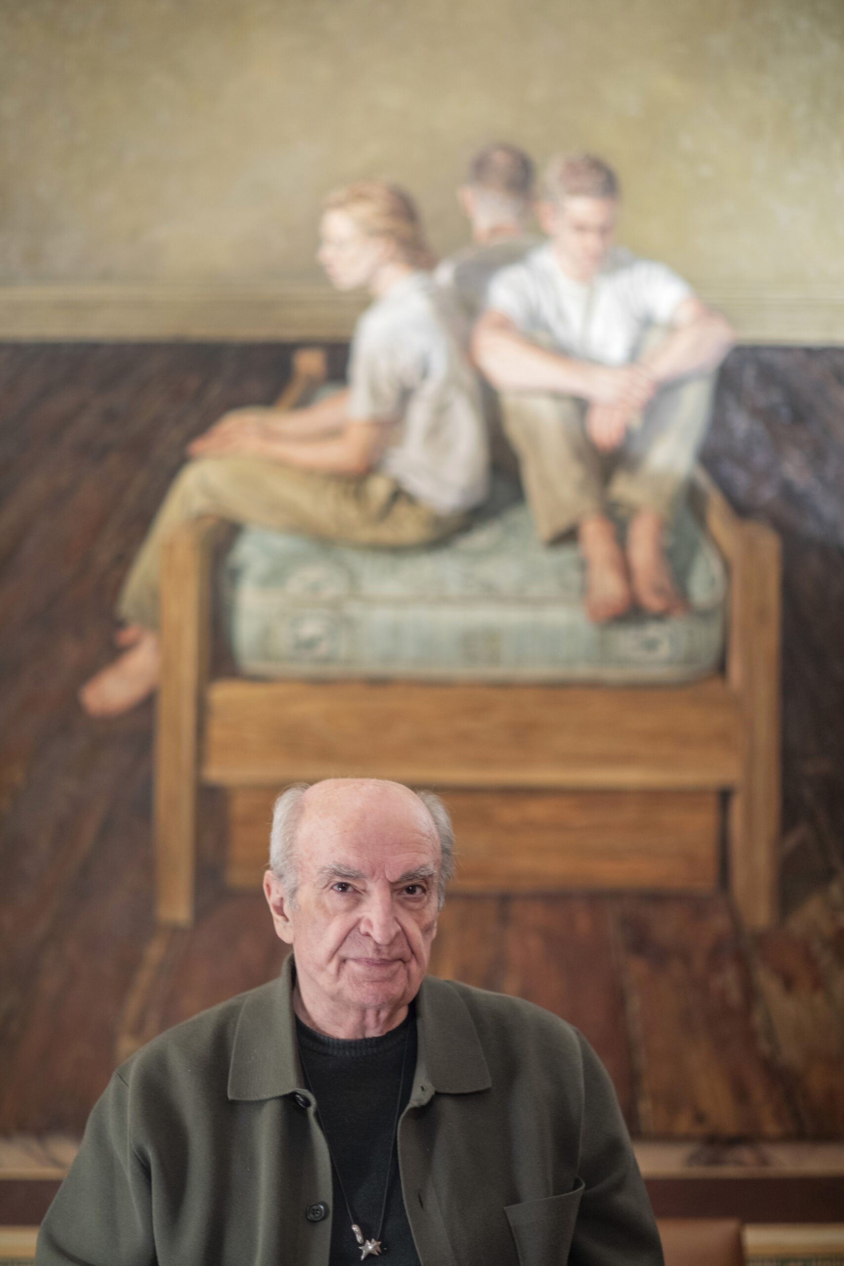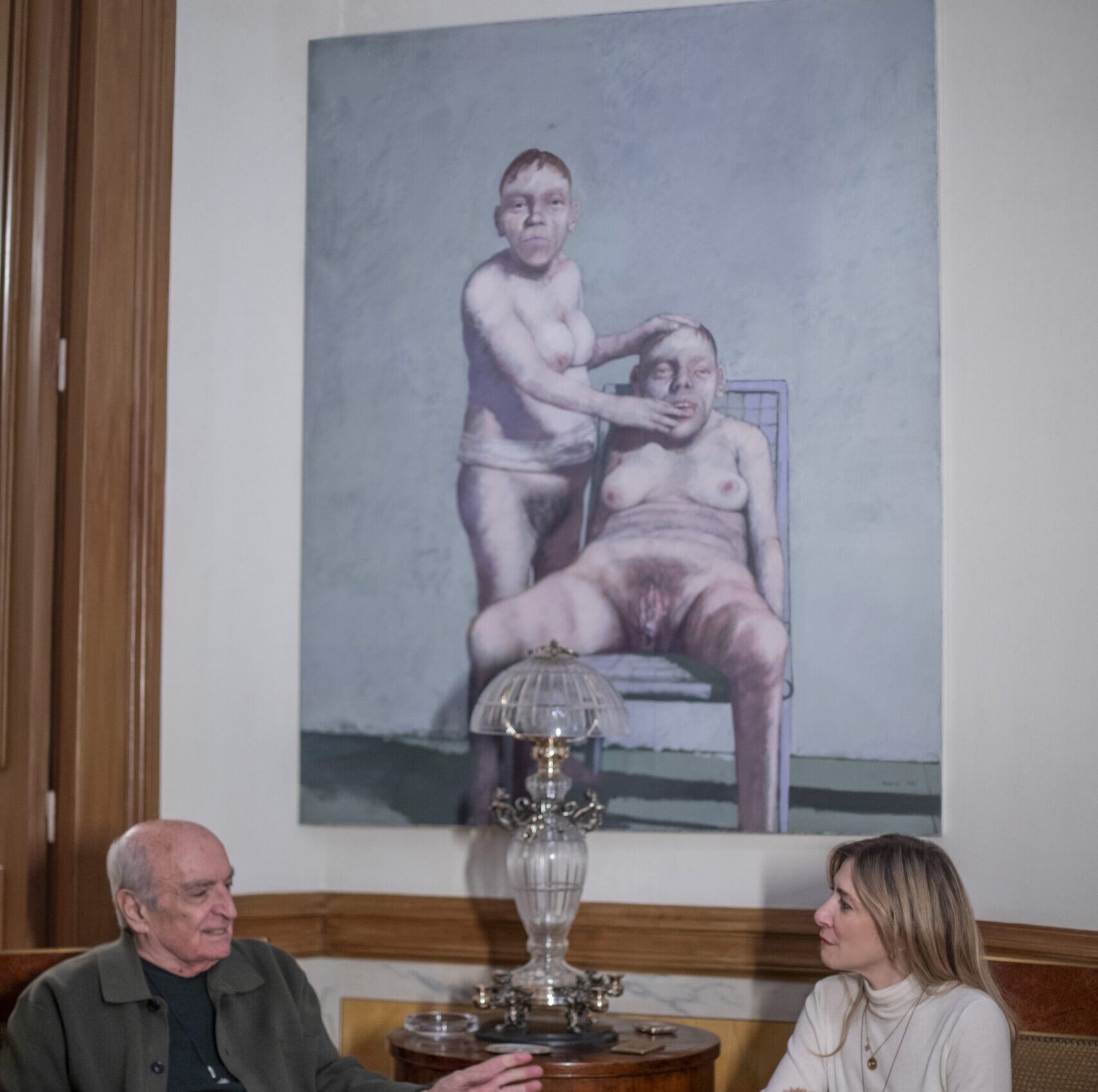 «Να αυτός είναι ο αγαπημένος μου», ομολογεί δείχνοντας τον Ζαν Ρουστέν (1928-2013) καθώς ξεφυλλίζει τον εξαιρετικό τόμο της συλλογής του Μουσείου Φρυσίρα. Πρόκειται για τον γάλλο αλληγορικό ζωγράφο, που συνθέτει στα έργα μία επιμειξία θανάτου, σεξ και εφιάλτη.