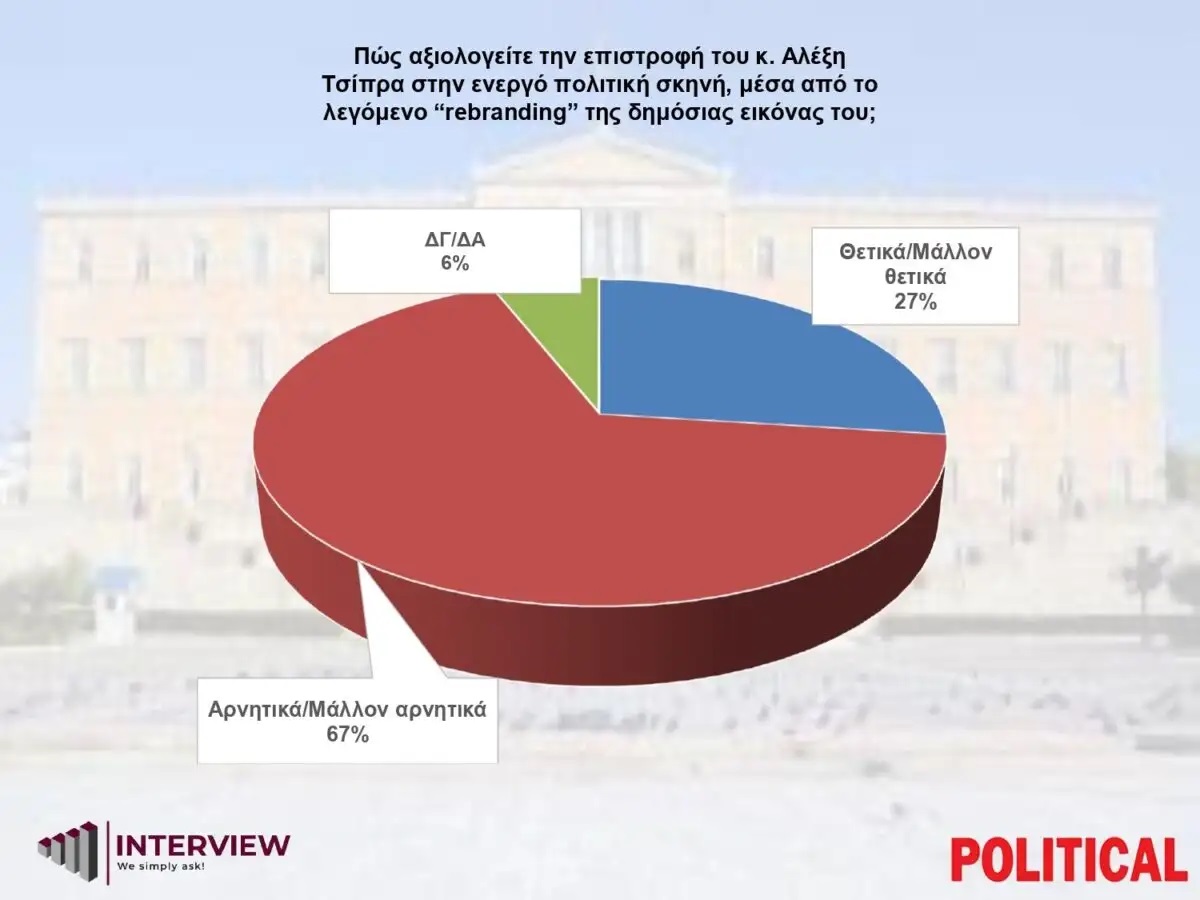 Αναφορικά με τη επιστροφή του Αλέξη Τσίπρα μέσα από το λεγόμενο «rebranding» το 29% τη βλέπει θετικά/μάλλον θετικά, το 67% αρνητικά/μάλλον αρνητικά και το 6% ΔΞ/ΔΑ.