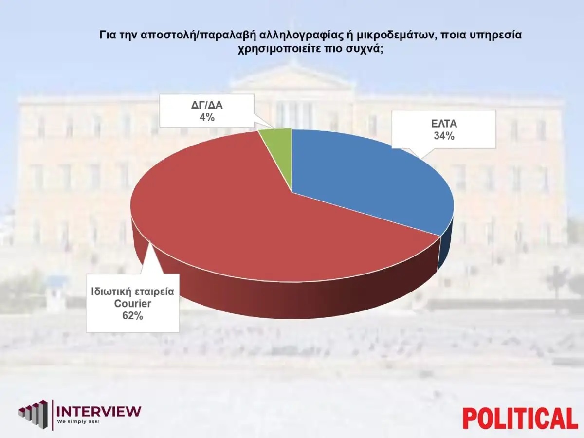 Στη δημοσκόπηση έγινε ερώτηση και για τα ΕΛΤΑ με το 62% να απαντά ότι προτιμά τις ιδιωτικές εταιρείες courier για αποστολή/παραλαβή αλληλογραφίας ή μικροδεμάτων, έναντι 34% που επιλέγει τα ΕΛΤΑ και 4% που απαντά ΔΞ/ΔΑ. Αυτό πολύ απλά σημαίνει ότι 6 στους 10 δεν προτιμούν τα ΕΛΤΑ.