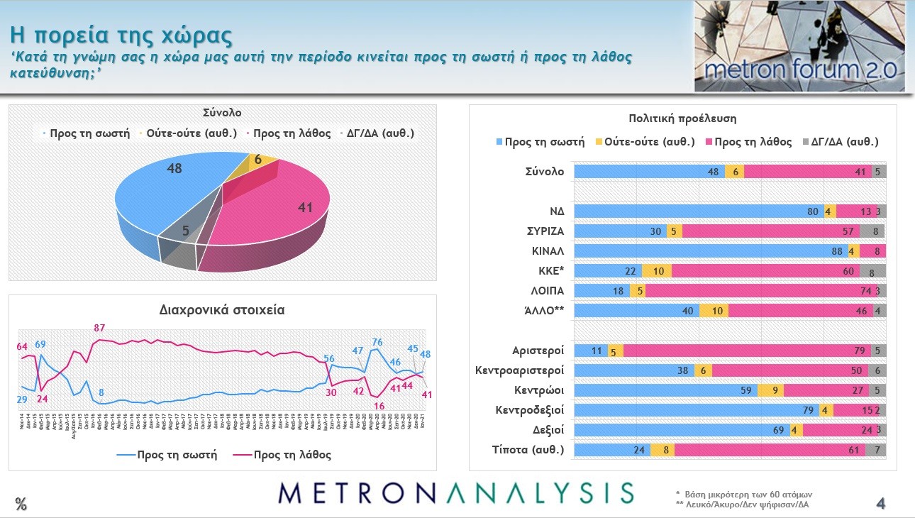 Σύμφωνα με τη δημοσκόπηση σχεδόν ένας στους δύο (48%) θεωρούν πως η χώρα κινείται προς την σωστή κατεύθυνση, με το 6% να εμφανίζεται ουδέτερο και το 41% να θεωρεί πως κινείται προς τη λάθος. Μεταξύ των ψηφοφόρων της ΝΔ μόλις ένα 13% θεωρεί πως κινείται προς τη λάθος κατεύθυνση, ενώ το 80% θεωρεί πως κινείται προς την σωστή. Αντίθετα, μεταξύ των ψηφοφόρων του ΣΥΡΙΖΑ ένα 30% θεωρεί πως κινείται προς τη σωστή κατεύθυνση9έναντι 57% που θεωρεί το αντίθετο. Έκπληξη αποτελεί το ποσοστό των ψηφοφόρων του ΚΙΝΑΛ που θεωρεί πως κινείται προς τη σωστή κατεύθυνση, το οποίο ξεπερνά και αυτό των ψηφοφόρων της ΝΔ, φτάνοντας το 88% έναντι μόλις 8% που εκφράζουν αντίθετη γνώμη.