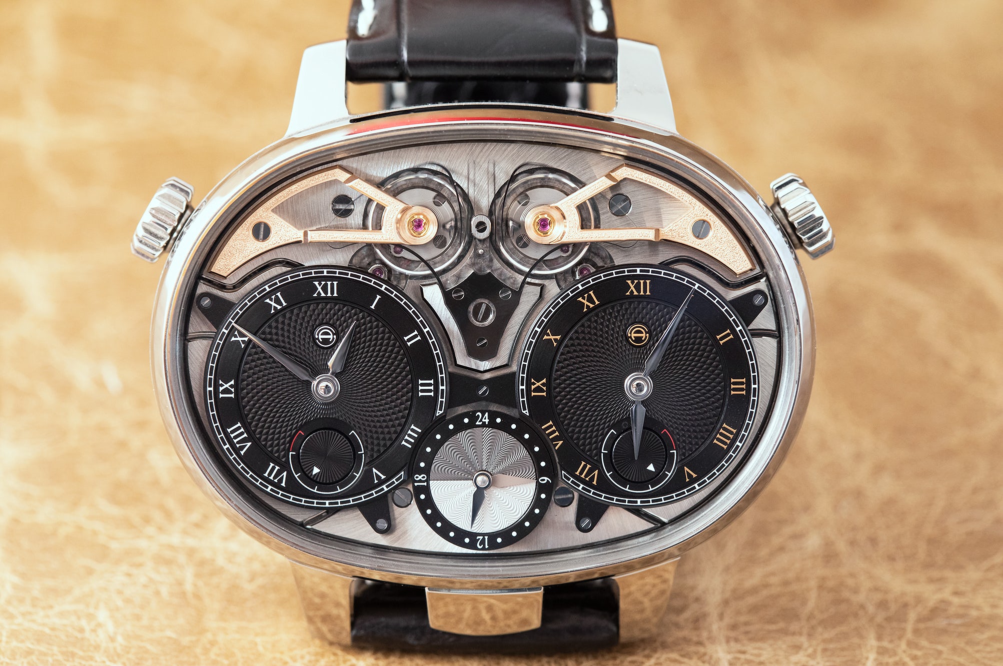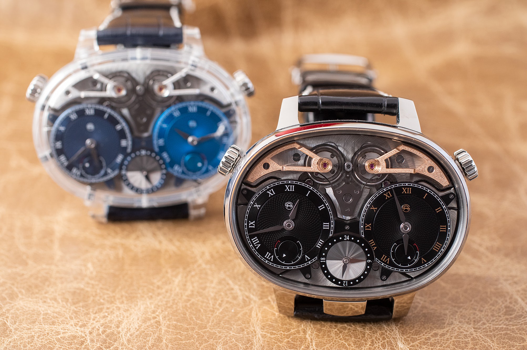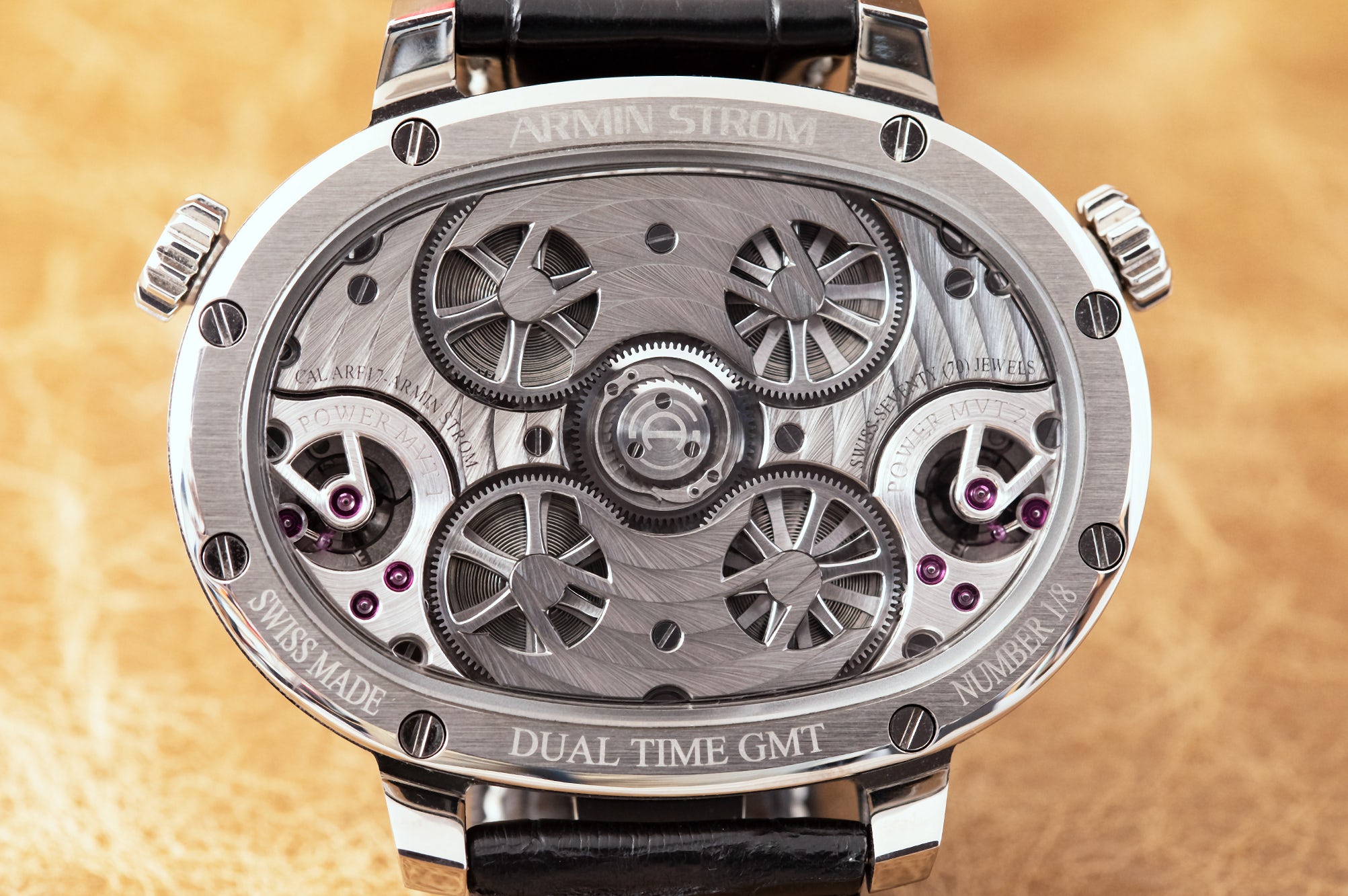 Στο νέο Masterpiece 1 Dual Time Resonance GMT, η Armin Strom συνδυάζει τους δύο ρότορες σε ένα διπλό καντράν, που επιτρέπει στον χρήστη να παρακολουθεί την ώρα σε δύο διαφορετικές χρονικές ζώνες ταυτόχρονα. Αναμενόμενα, είναι ένα τεράστιο σε μέγεθος ρολόι, με διαστάσεις 59mm x 43.4mm και πάχος 15,90 mm, που θυμίζουν περισσότερο ρολόι τσέπης, παρά χειρός. Αξιοσημείωτο είναι ότι το απόθεμα ενέργειας του ρολογιού φτάνει τις 110 ώρες.