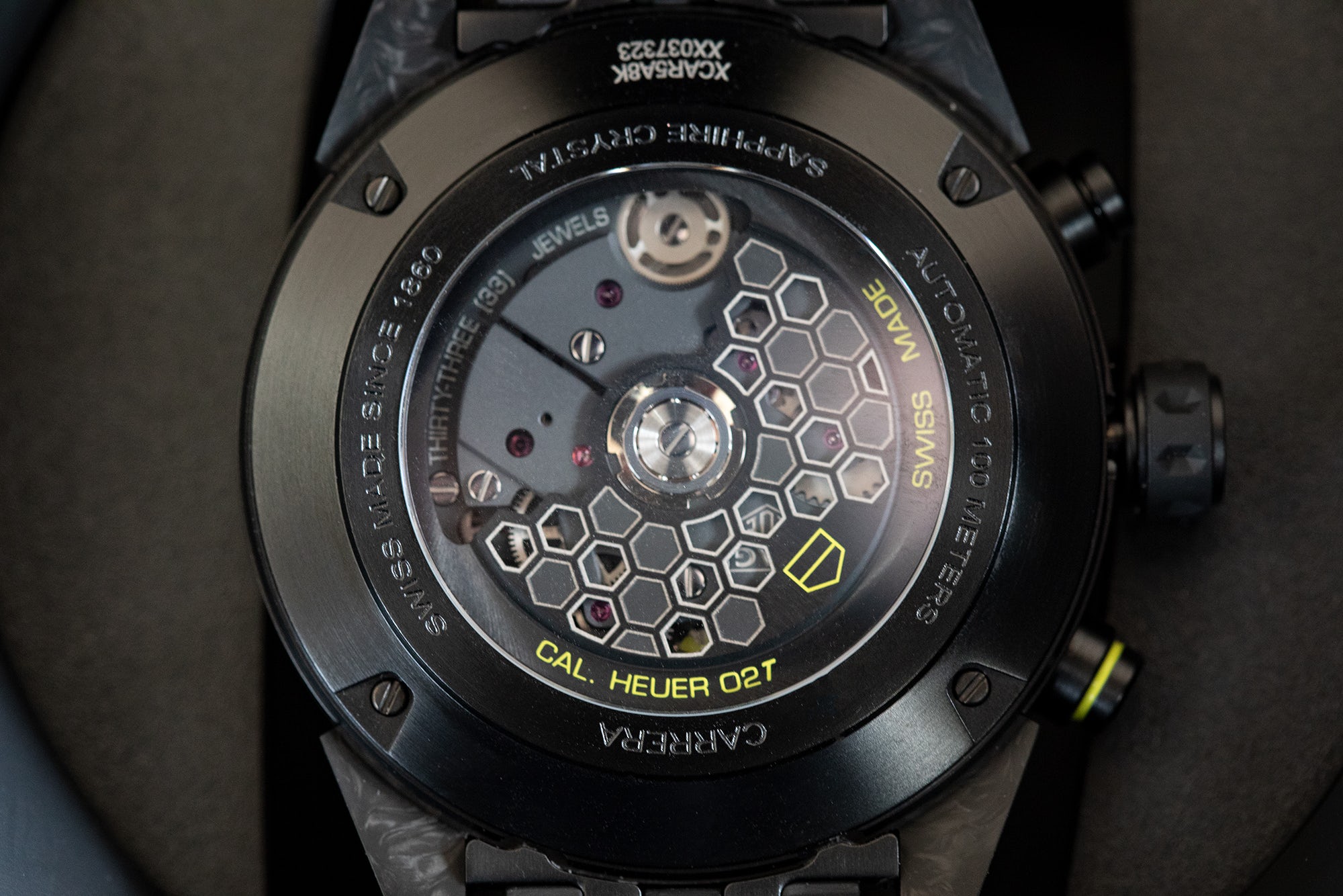 Για να δημιουργήσει το Carrera Calibre Heuer 02T Tourbillon Nanograph, η TAG Heuer επινόησε μία εξαιρετικά σύνθετη διαδικασία που διασφαλίζει την υψηλή ακρίβεια και συνέπεια του ελατηρίου, αξιοποιώντας τις ιδιότητες του γραφενίου, μίας μορφής άνθρακα που αποτελείται από άτομα άνθρακα σε εξαγωνική παράταξη. Η θερμική διαστολή του ελατηρίου είναι σταθερή, δεν επηρεάζεται από τον μαγνητισμό, ενώ είναι πολύ ελαφρύ και εξαιρετικά ανθεκτικό στους κραδασμούς. Είναι προφανές ότι η εταιρεία έδωσε μεγάλο βάρος στα τεχνικά χαρακτηριστικά του μηχανισμού που κινεί τον χρονογράφο της.