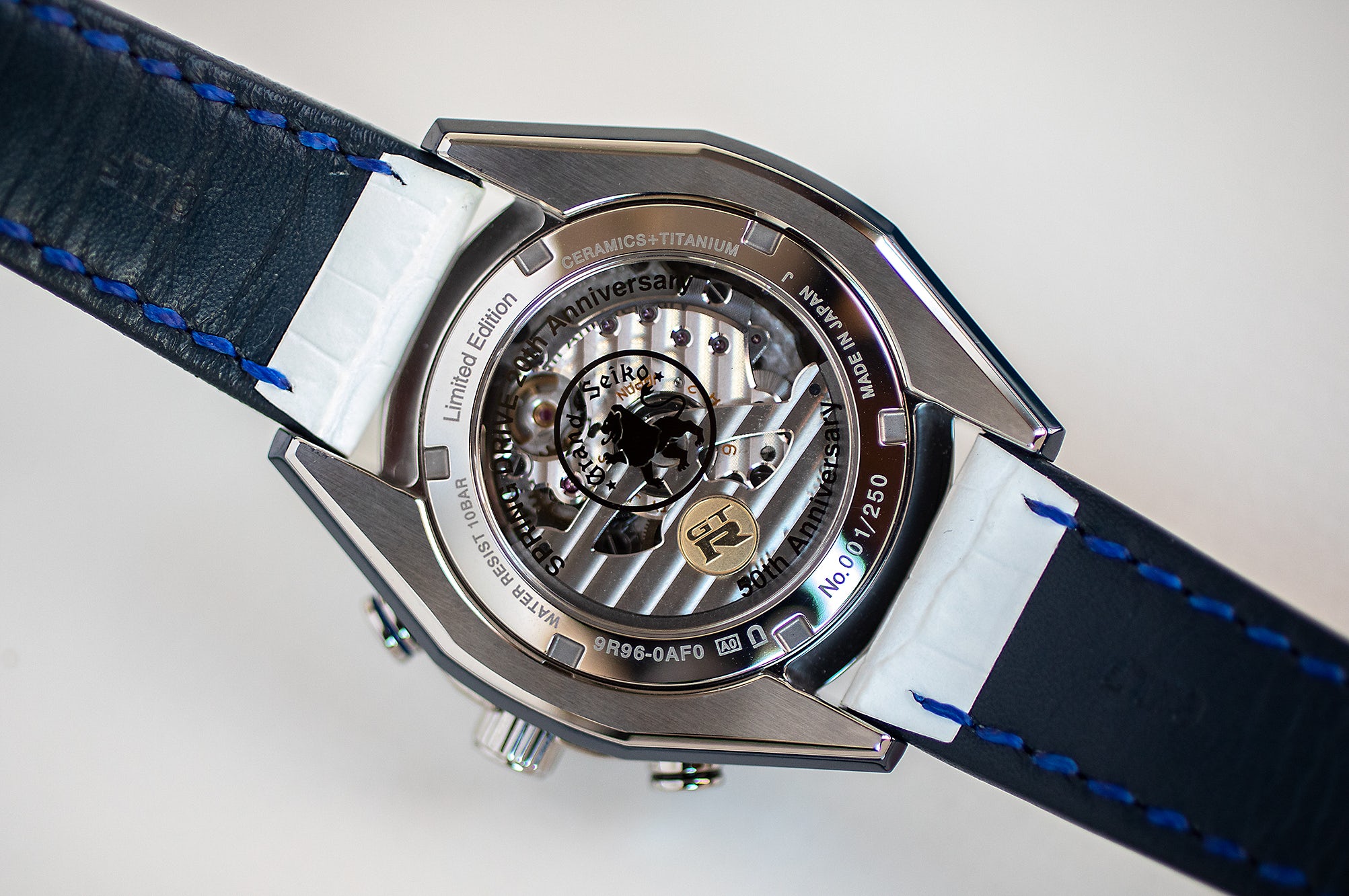 Πέρα από τη γαλάζια κάσα, το Spring Drive Chronograph GMT χρησιμοποιεί το μπλε και για λεπτομέρειες στο καντράν, ενώ κάθε τμήμα του ρολογιού συνδέεται με κάποιο τρόπο με το αυτοκίνητο. Ο μηχανισμός στην «καρδιά» του ρολογιού είναι ο GMT 9R96.