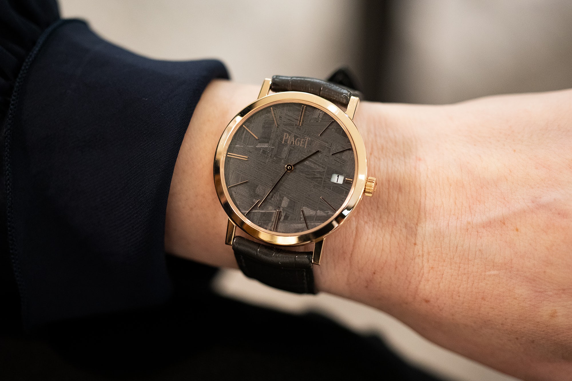 Για τη φετινή έκθεση SIHH 2019, η Piaget αποκάλυψε μία νέα εκδοχή του Altiplano με καντράν από μετεωρίτη σε κάσα από ροζ χρυσό, με δείκτες από ροζ χρυσό. Ο μετεωρίτης είναι ένα υλικό που χρησιμοποιείται σποραδικά από τη δεκαετία του ’80, όμως δεν είναι ιδιαίτερα διαδεδομένο υλικό, καθώς είναι δύσχρηστο – πόσο μάλλον όταν πρέπει να ενσωματωθεί σε ένα εξαιρετικά λεπτό ρολόι. Είναι όμως και ένα εντυπωσιακό υλικό, το οποίο παρουσιάζει μοναδικές γραμμώσεις για κάθε ρολόι, καθιστώντας το κάθε κομμάτι του μοναδικό.