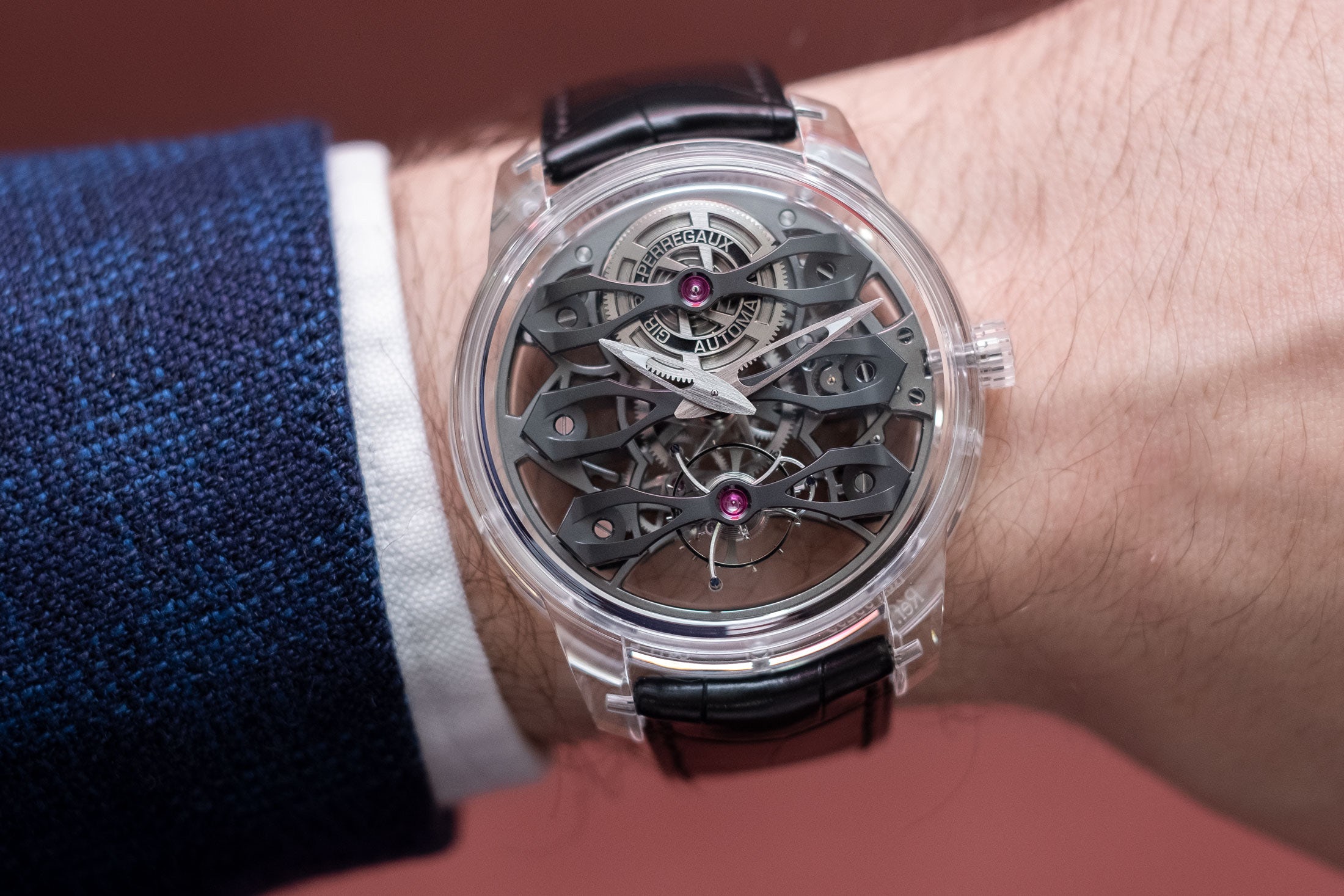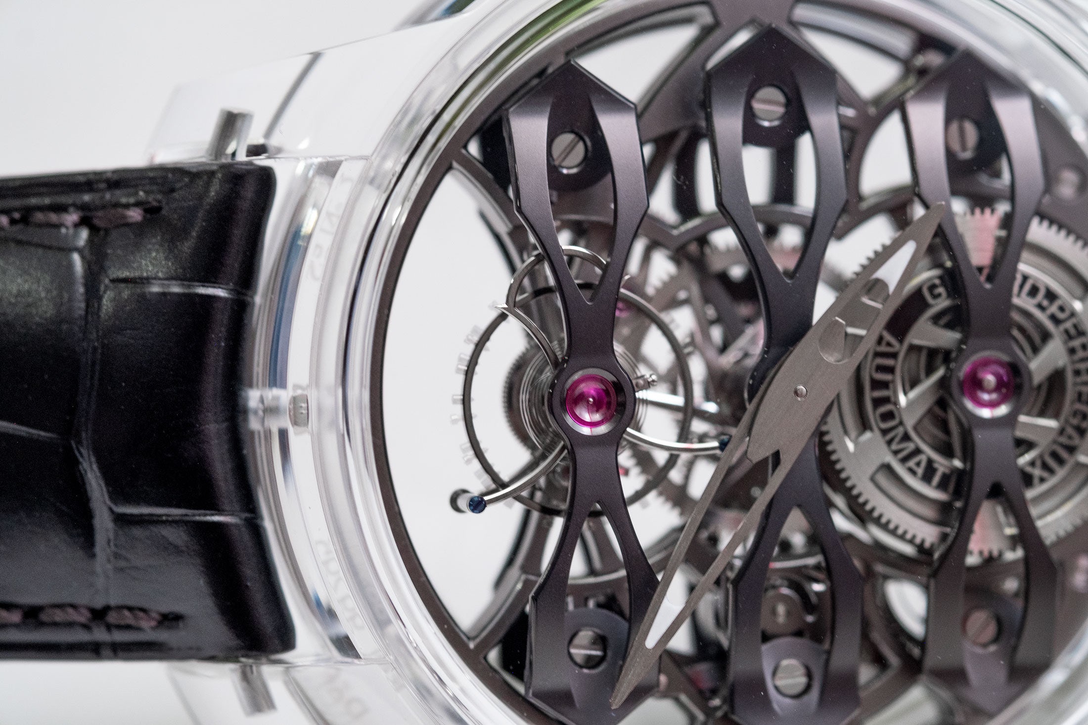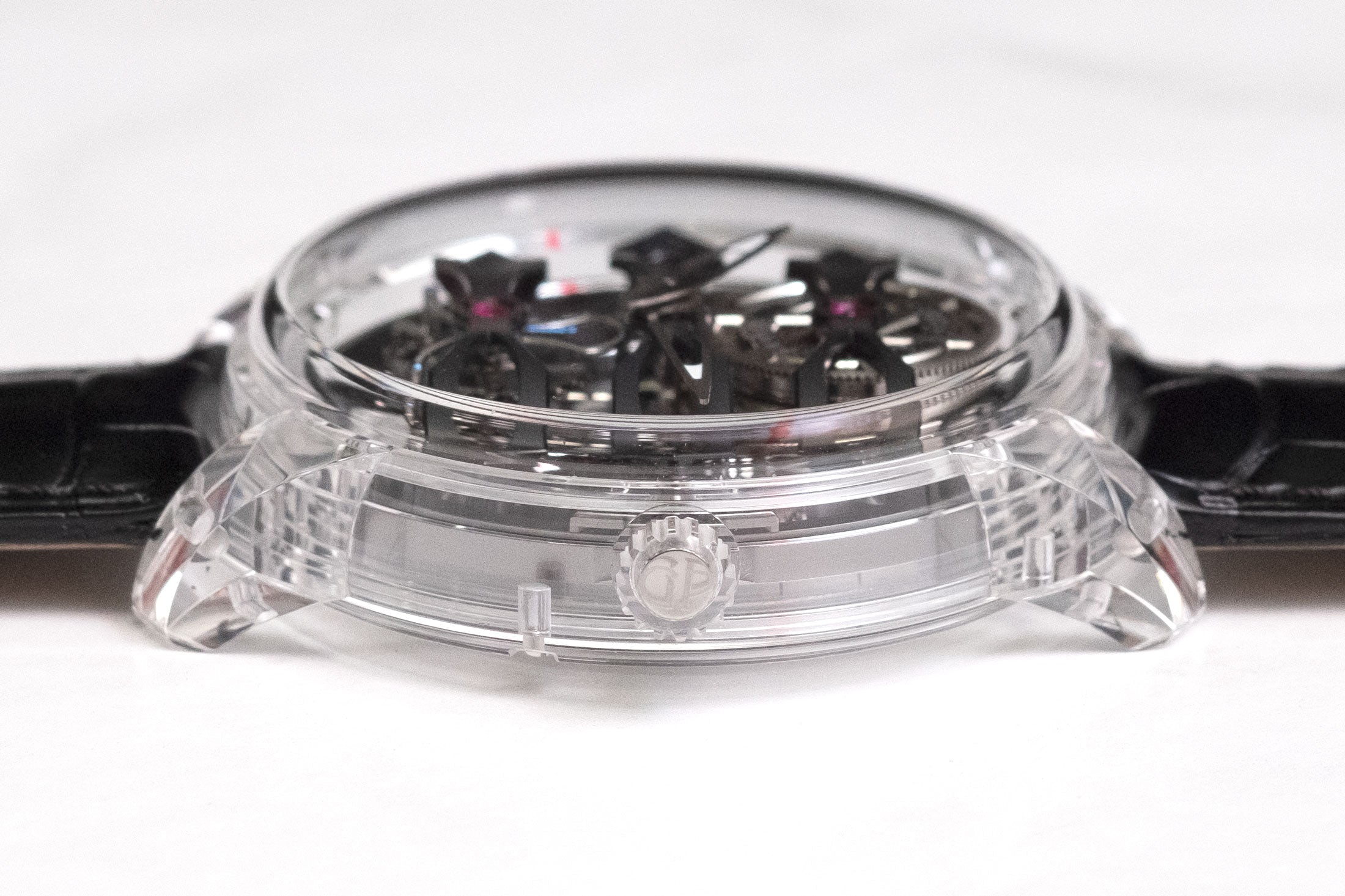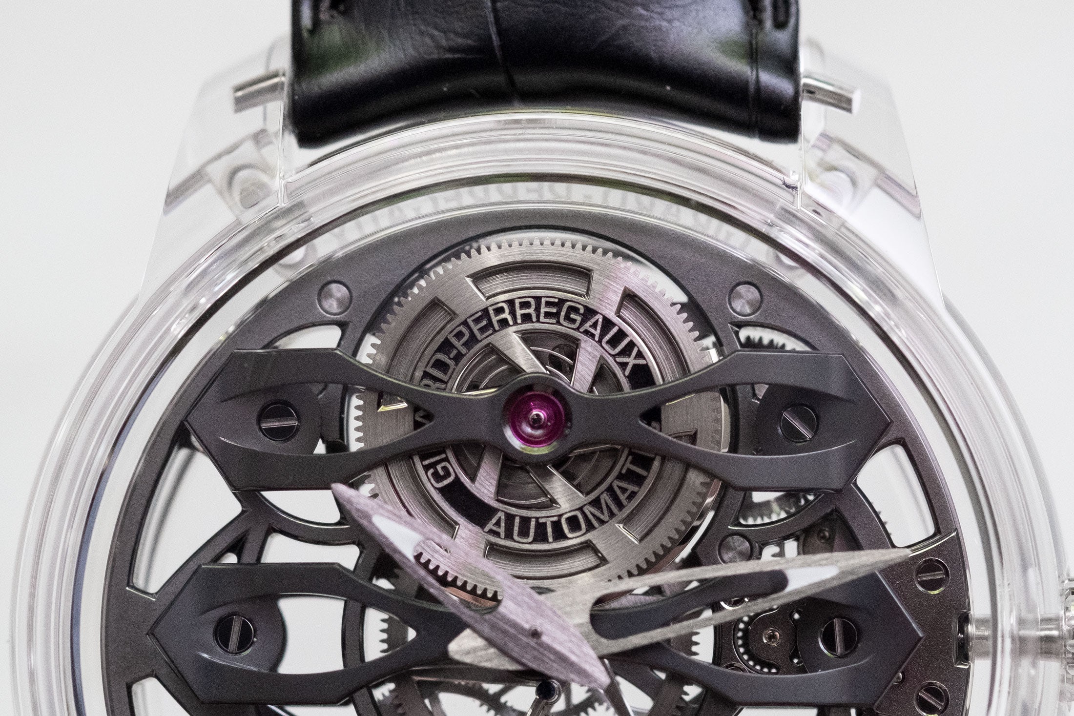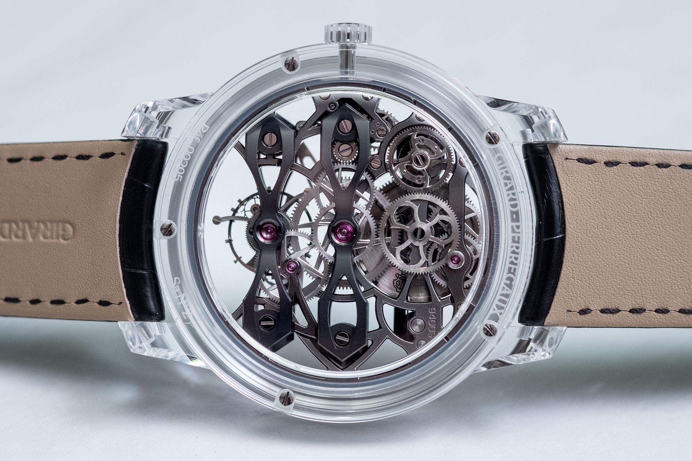 Δεν είναι το πρώτο ρολόι με κάσα από ζαφείρι, όμως είναι ένα από τα πιο ενδιαφέροντα. Οι κατασκευαστές ρολογιών που πειραματίζονται με κάσες από ζαφείρι συνήθως είτε επιλέγουν την απόλυτη διαφάνεια, είτε απλώς «τυλίγουν» με αυτές ήδη υπάρχοντες μηχανισμούς και καντράν. Εδώ όμως η Girard-Perregaux ποντάρει στο κοντράστ: το ανοιχτό χρώμα της κάσας κάνει μία όμορφη αντίθεση με τις μαύρες «γέφυρες» του μηχανισμού, που παρακολουθώντας τον μπορεί κανείς να κατανοήσει καλύτερα το πώς λειτουργεί αυτή η μοναδική δομή της εταιρείας.