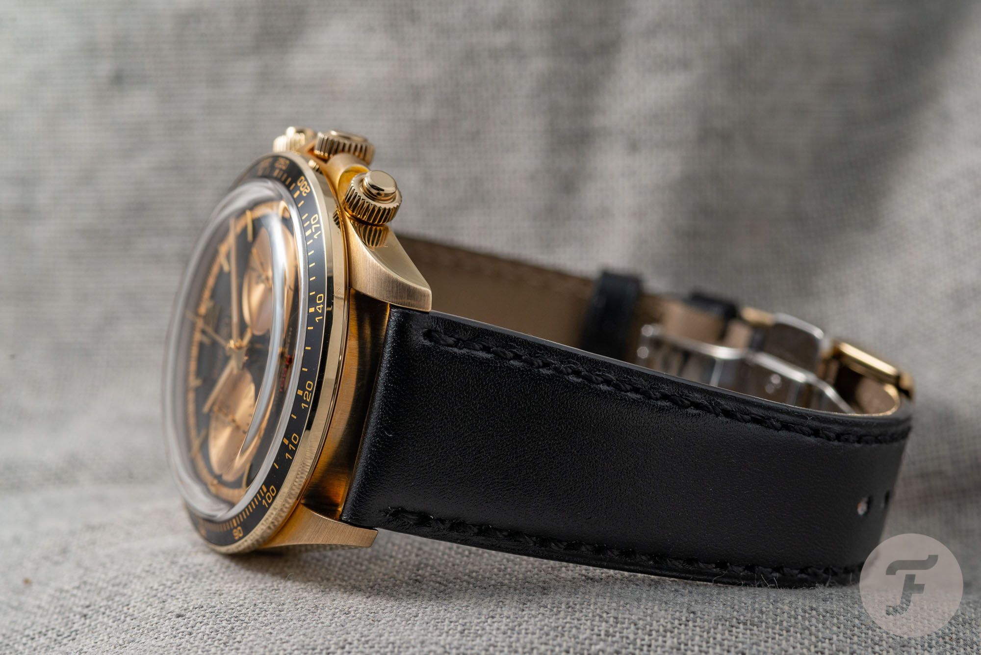 Γύρω από το καντράν ξεχωρίζει ο μαύρος δακτύλιος με τους χρυσούς αριθμούς, ενώ στο καντράν είναι έξυπνη η επιλογή της εταιρείας να τοποθετήσει λεπτούς δείκτες και ο συνδυασμός των χρωμάτων εκπέμπει μία ευπρόσδεκτη θέρμη, ενώ ταιριάζει όμορφα σε ένα ελαφρώς μαυρισμένο χέρι. Ίσως θα μπορούσε να λείπει η ένδειξη της ημερομηνίας κάτω δεξιά, αν και μάλλον περνά σχετικά απαρατήρητη.