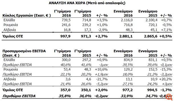 Σε ένα περιβάλλον που παραμένει δύσκολο στις δύο βασικές αγορές του ΟΤΕ, Ελλάδα και Ρουμανία, το Γ’ τρίμηνο του 2016, τα ενοποιημένα έσοδα του Ομίλου ανήλθαν σε €997,9 εκατ., αυξημένα κατά 2,7% σε σχέση με το Γ’ τρίμηνο του 2015, κυρίως χάρη στην σημαντική αύξηση στα έσοδα της σταθερής Ελλάδας.