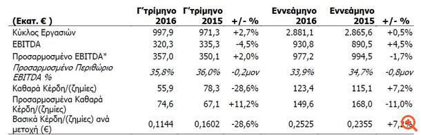 Τα καθαρά κέρδη του Ομίλου ανήλθαν σε €55,9 εκατ. το Γ’ τρίμηνο του 2016. Σε προσαρμοσμένη βάση, εξαιρουμένων των εκτάκτων χρεώσεων, τα καθαρά κέρδη του Ομίλου αυξήθηκαν κατά 11,2% σε €74,6 εκατ. το τρίμηνο.