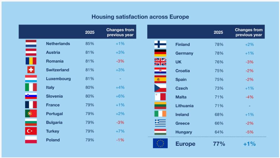 Σε όλη την Ευρώπη, οι ιδιοκτήτες κατοικιών αναφέρουν 85% ικανοποίηση από την κατοικία σε σύγκριση με 61% μεταξύ των ενοικιαστών, ένα χάσμα 24 μονάδων που υπογραμμίζει τη διαρκή ελκυστικότητα της ιδιοκτησίας.
