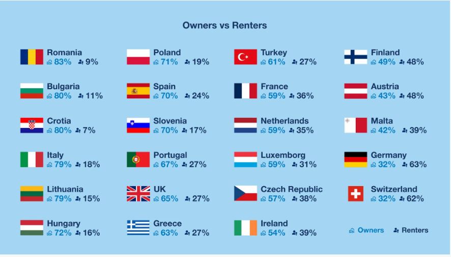 Στη Γερμανία και την Ελβετία, οι ενοικιαστές αποτελούν την πλειοψηφία, ενώ στη Ρουμανία και τη Βουλγαρία, η ιδιοκατοίκηση είναι σχεδόν 100%.