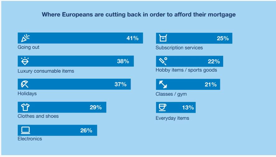 Την ίδια στιγμή, τρεις στους τέσσερις Ευρωπαίους με στεγαστικά δάνεια δηλώνουν ότι έχουν μειώσει τις δαπάνες σε πράγματα που τους ευχαριστούν, προκειμένου να ανταποκριθούν στις πληρωμές των δανείων τους.