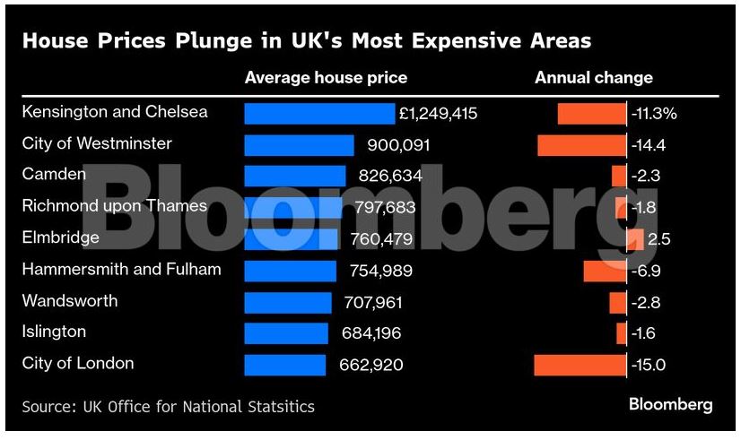 Σύμφωνα με το Bloomberg, οι τιμές μειώθηκαν σχεδόν κατά 160.000 λίρες (210.000 δολάρια) έως τον Σεπτέμβριο, σε περιοχές που ο μέσος όρος τιμών ξεπερνά το 1 εκατομμύριο λίρες.