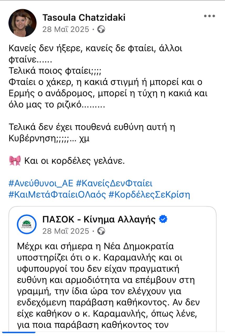 Μερικές από τις αναρτήσεις που έκανε η Αναστασία Χατζηδάκη κατά της κυβέρνησης για τον σκάνδαλο του ΟΠΕΚΕΠΕ: