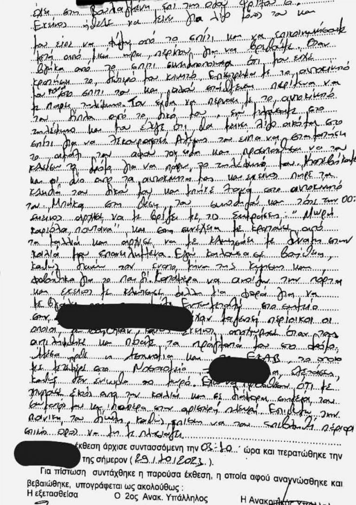 Η κατάθεση στο Αστυνομικό Τμήμα Αλίμου περιέχει τη διήγηση της 27χρονης γυναίκας για το περιστατικό με τον 48χρονο εφοπλιστή. Η αξιωματικός υπηρεσίας που επιλήφθηκε του περιστατικού σημειώνει ότι «σύμφωνα με την κατάθεση της ανωτέρω την 00.10 της 29ης Οκτωβρίου του 2023 δέχτηκε σωματική επίθεση από τον σύντροφό της ο οποίος την κλωτσούσε επανειλημμένα στην κοιλιά της και σε διάφορα σημεία του σώματός της, τόσο με κλωτσιές όσο και με τα χέρια του, ενώ επίσης την κρατούσε από τα μαλλιά».