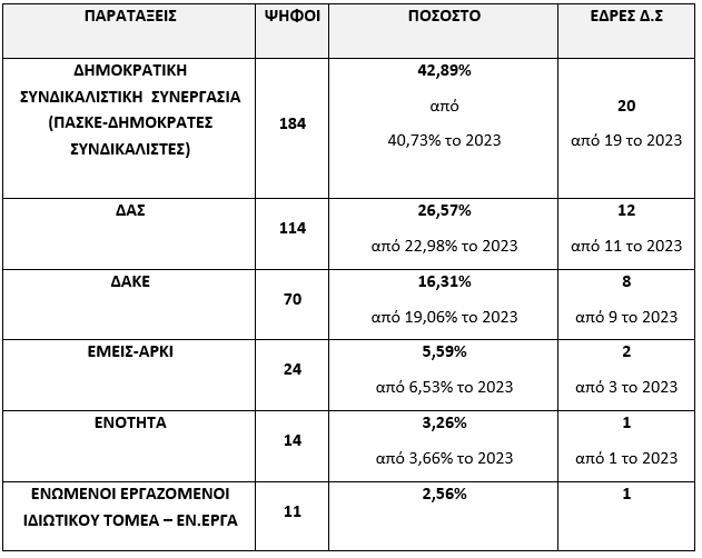 Τα αποτελέσματα των εκλογών έχουν ως εξής: Ψήφισαν 430, έγκυρα 429, άκυρα 1, λευκά 0. Αναλυτικά ανά παράταξη τα αποτελέσματα έχουν ως εξής: