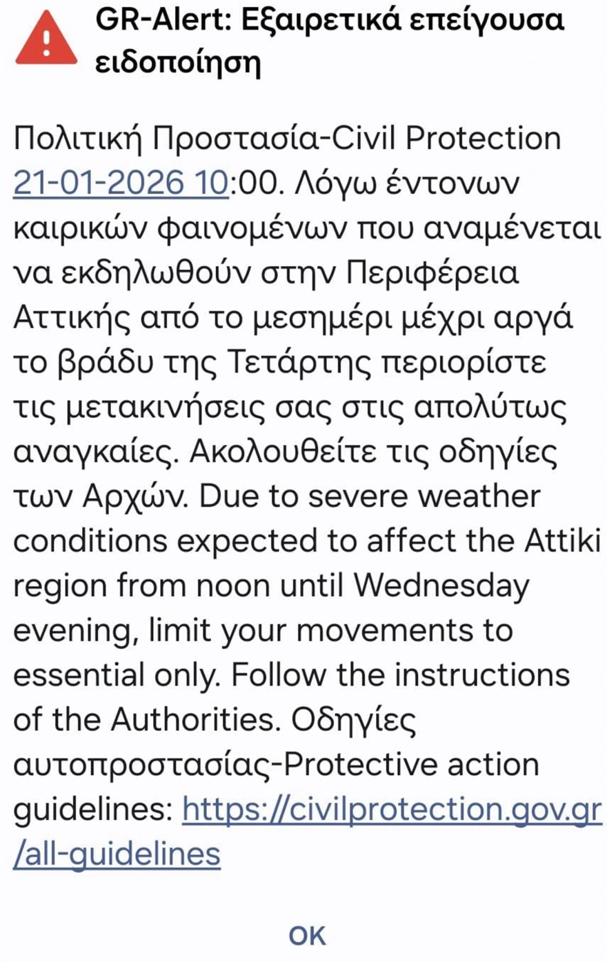 Νωρίτερα είχε σταλεί μήνυμα από το 112 στην Αττική, την Εύβοια και τη Βοιωτία λόγω της κακοκαιρίας. Το μήνυμα της Πολιτικής Προστασίας ζητά από τους πολίτες να περιορίσουν τις μετακινήσεις τους λόγω των έντονων φαινομένων που αναμένεται να εκδηλωθούν στην Αττική