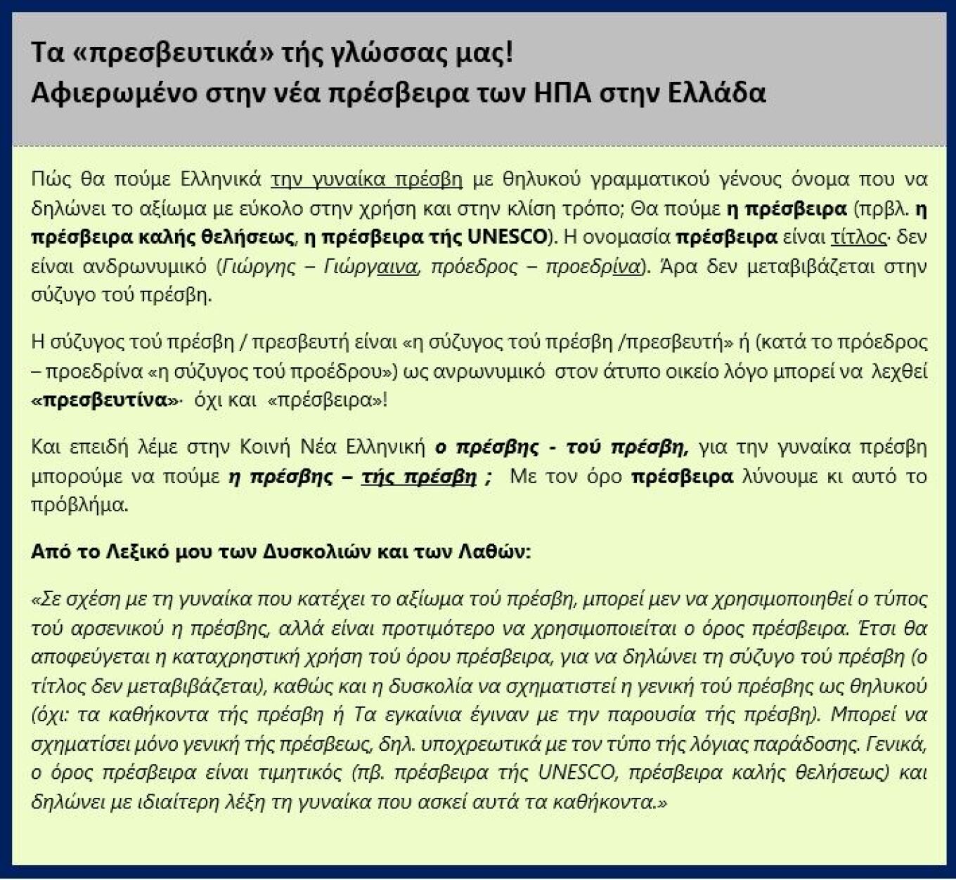 «Με αυτόν τον τρόπο αποφεύγεται η εσφαλμένη χρήση του όρου “πρέσβειρα” για τη σύζυγο πρέσβη – καθώς ο τίτλος δεν μεταβιβάζεται – αλλά και η δυσκολία σχηματισμού γενικής του “πρέσβης” ως θηλυκού», σημειώνει ο γλωσσολόγος.