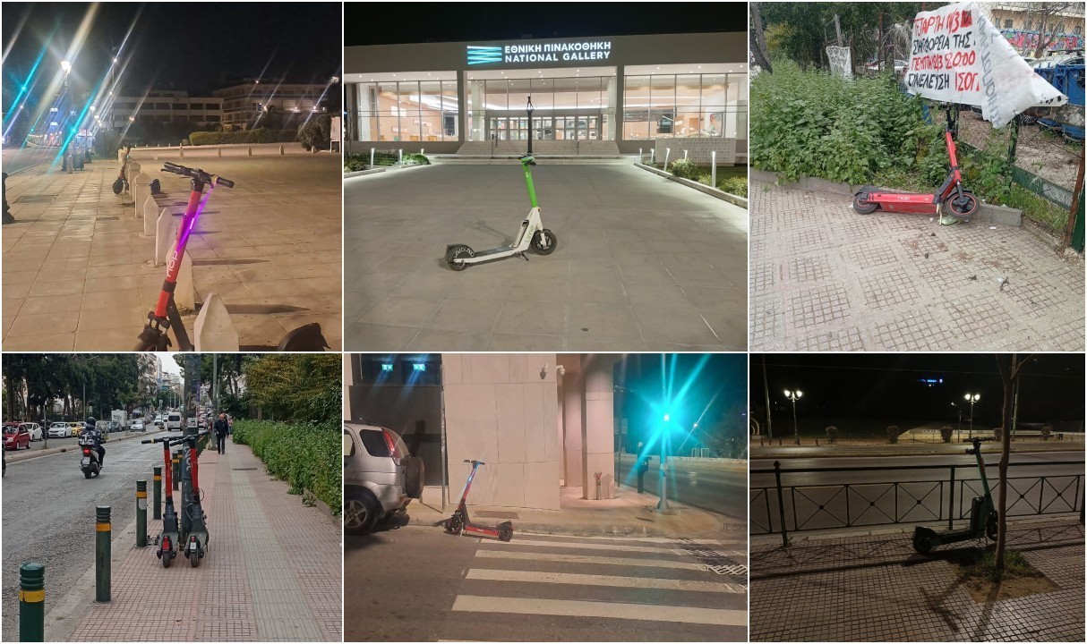 Παρ’ όλο που ο νέος κανονισμός κυκλοφορίας και στάθμευσης για τα Ελαφρά Προσωπικά Ηλεκτρικά Οχήματα (ΕΠΗΟ) προβλέπει την ύπαρξη χώρων στάθμευσης, η εικόνα απέχει από την πραγματικότητα με τα e-scooters να βρίσκονται παρατημένα σε ακανόνιστους χώρους, όπως δείχνουν και οι παρακάτω φωτογραφίες.