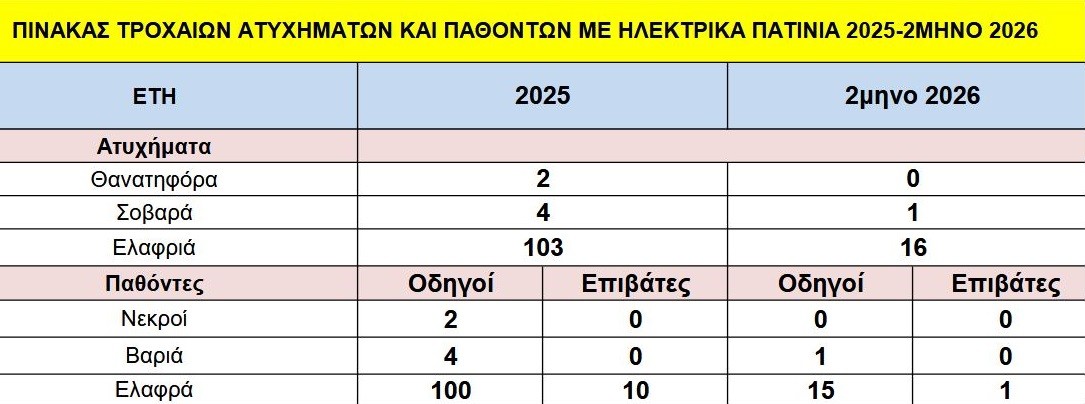 Τέλος, το πρώτο δίμηνο του 2026 τα τροχαία ατυχήματα είναι ήδη 17, εκ των οποίων το 1 ήταν σοβαρό και τα υπόλοιπα 16 ελαφριά.