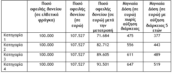 Δ/ Η Κατηγορία 4 είναι χωρίς εισοδηματικά και περιουσιακά κριτήρια. Οι δανειολήπτες αυτοί έχουν τη δυνατότητα μετατροπής της οφειλής σε ευρώ, στο σύνολό της, με τους ακόλουθους όρους: